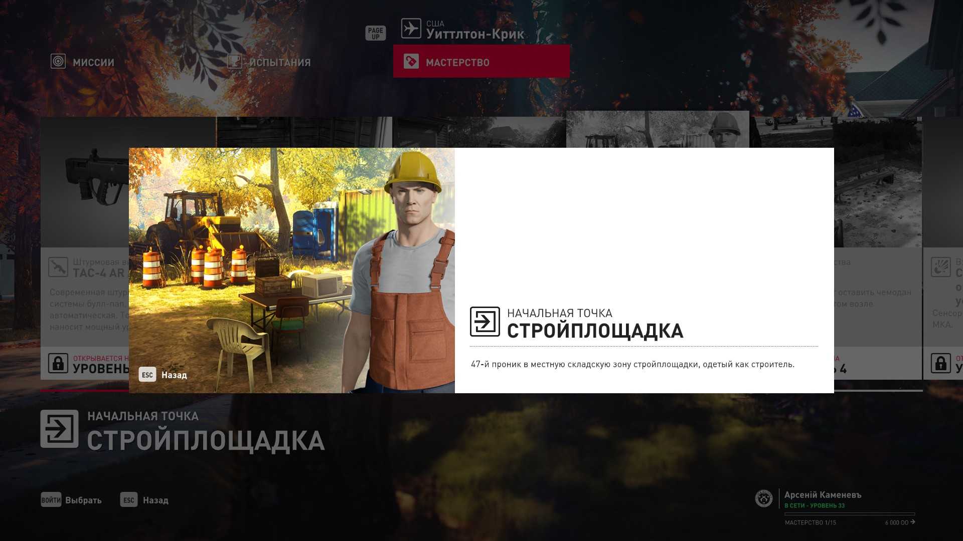 4 уровень мастерства: Начальная точка на стройплощадке в маскировке строителя и тайник МКА у скамейки