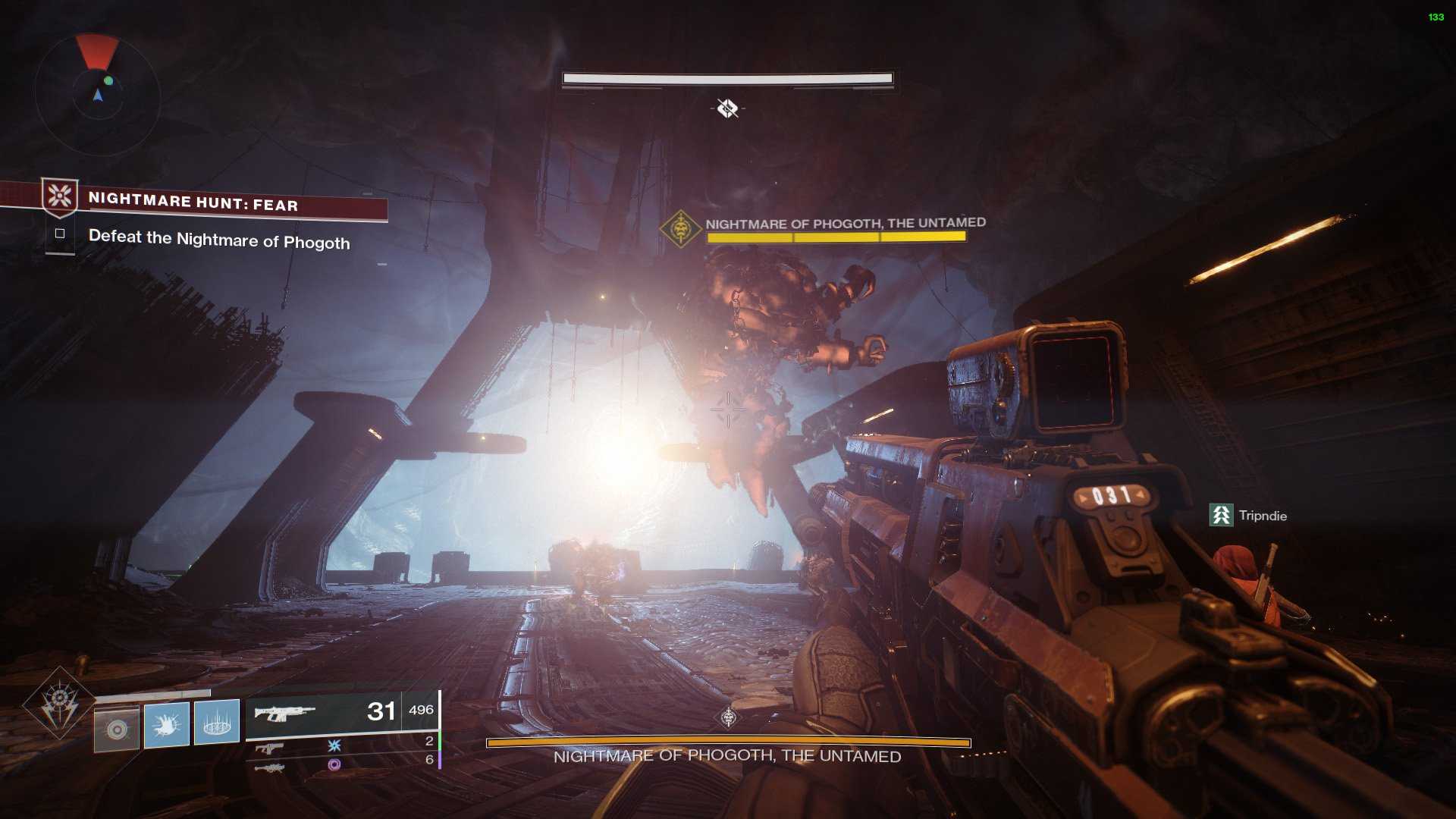 Пробейтесь под поверхностью Луны в комнату, где обитает Кошмар Омнигула. Вам нужно будет убить всех врагов в комнате, прежде чем вы сможете нанести ей урон, прежде чем она будет защищена. После победы над ней вы получите Сущность Мучения.