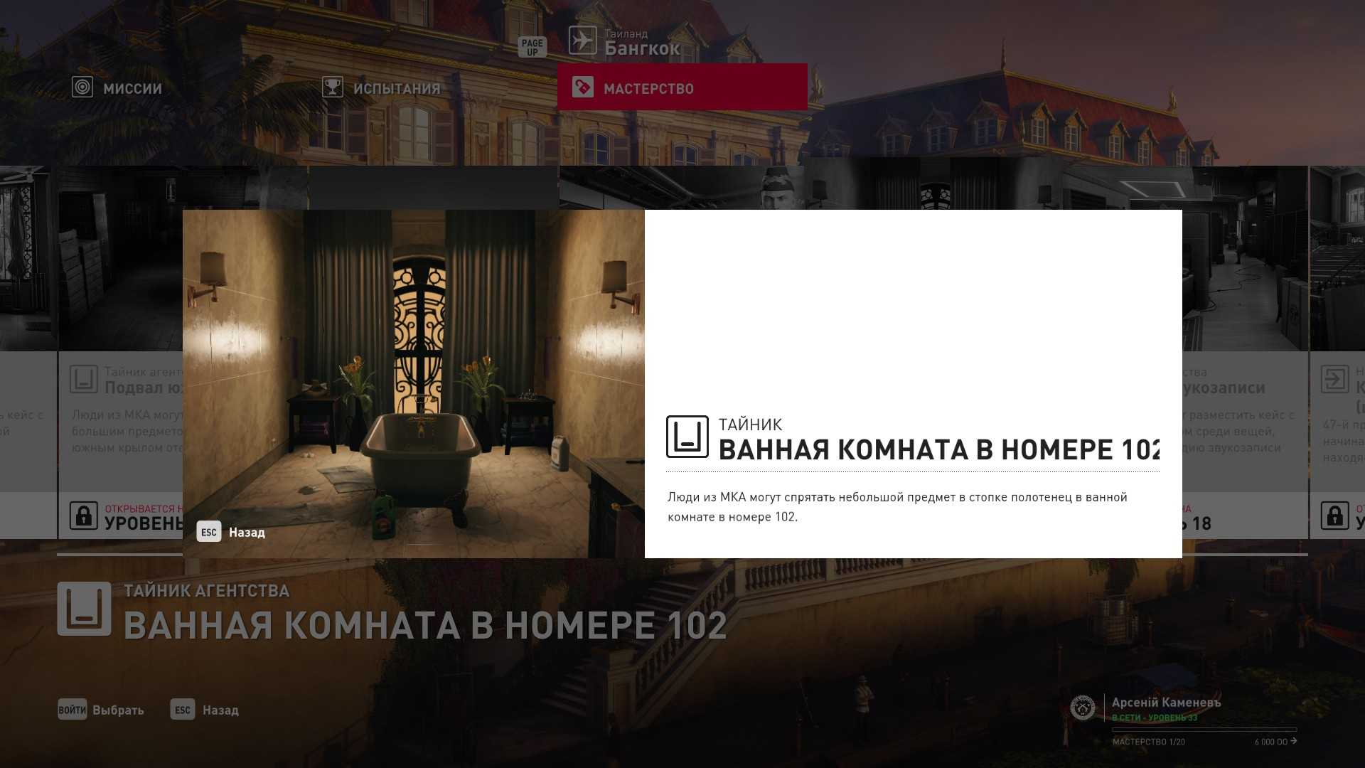 16 уровень мастерства: Начальная точка в бельевой в маскировке сотрудника отеля 17 уровень мастерства: Тайник МКА в ванной номера 102