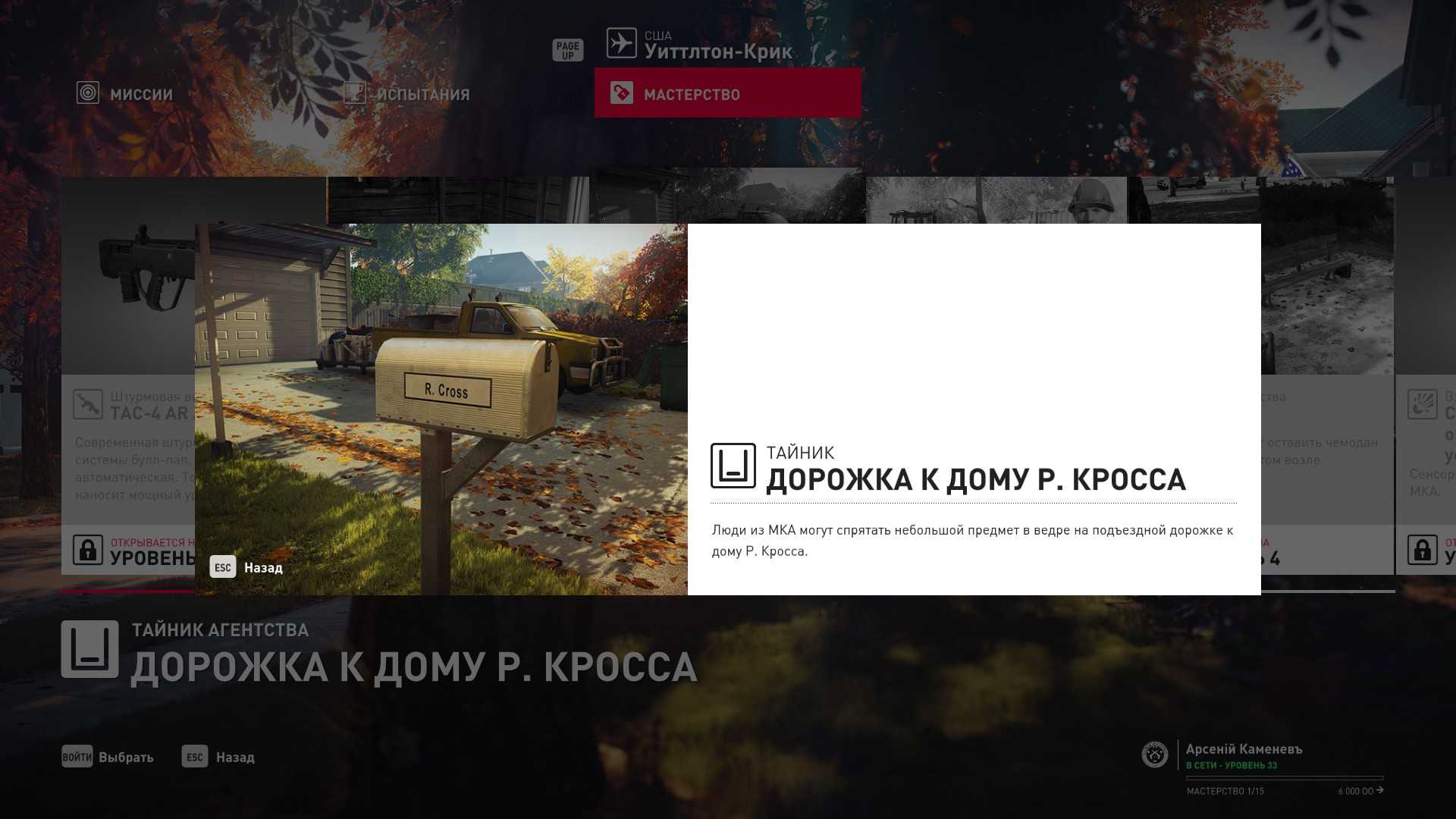 5 уровень мастерства: Штурмовая винтовка TAC-4 AR Auto 6 уровень мастерства: Тайник МКА в гараже особняка