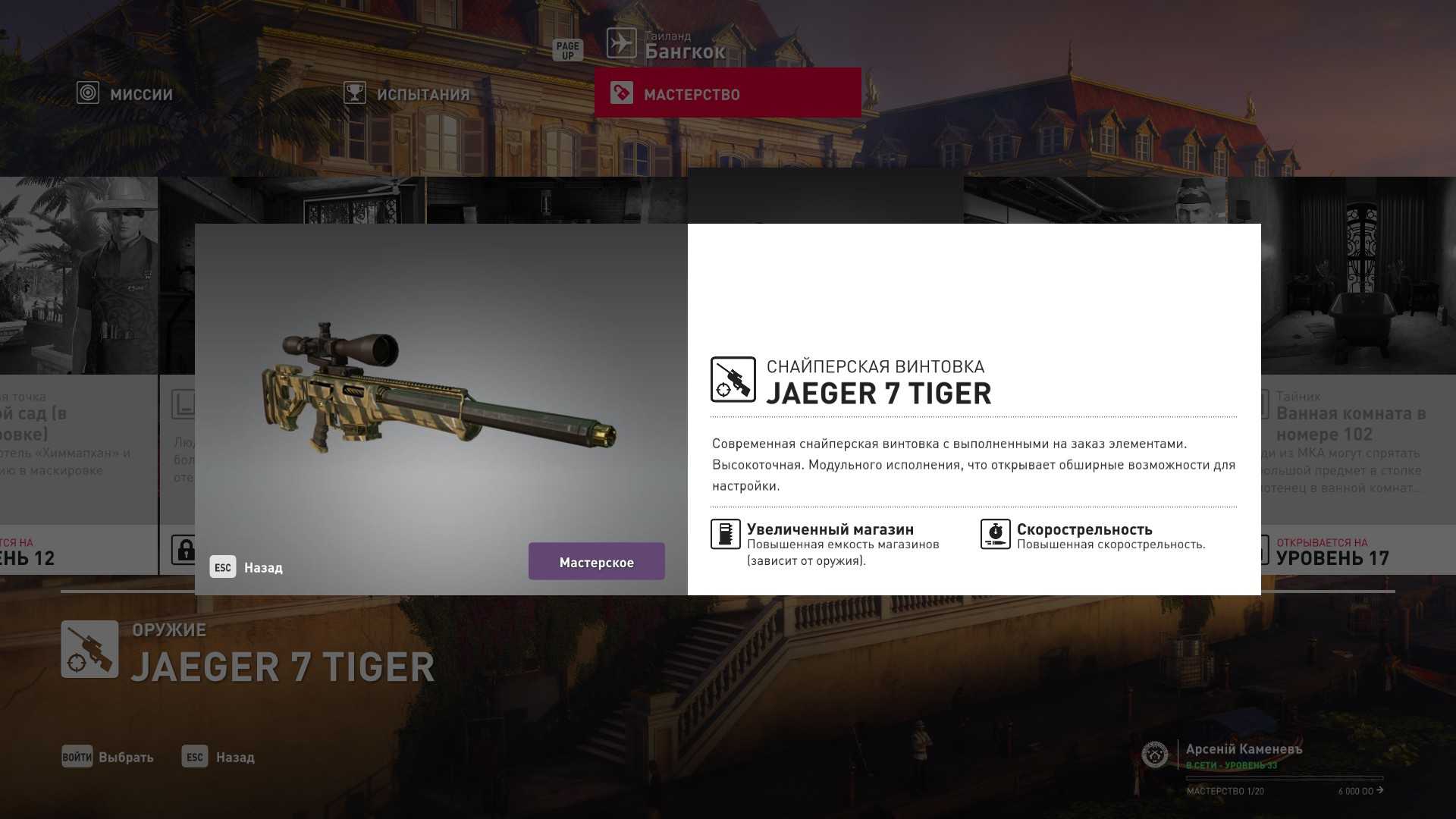15 уровень мастерства: Снайперская винтовка Jaeger 7 Tiger 16 уровень мастерства: Начальная точка в бельевой в маскировке сотрудника отеля