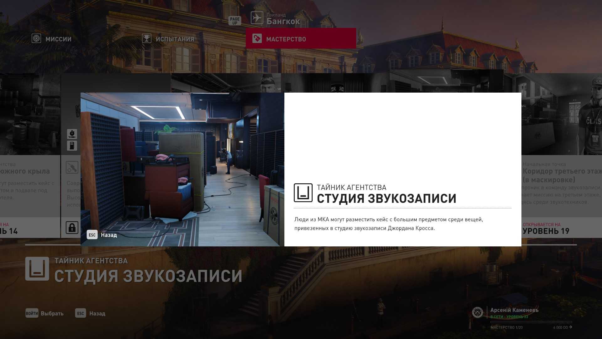 18 уровень мастерства: Тайник МКА в студии звукозаписи 19 уровень мастерства: Начальная точка в коридоре третьего этажа в маскировке звукотехника