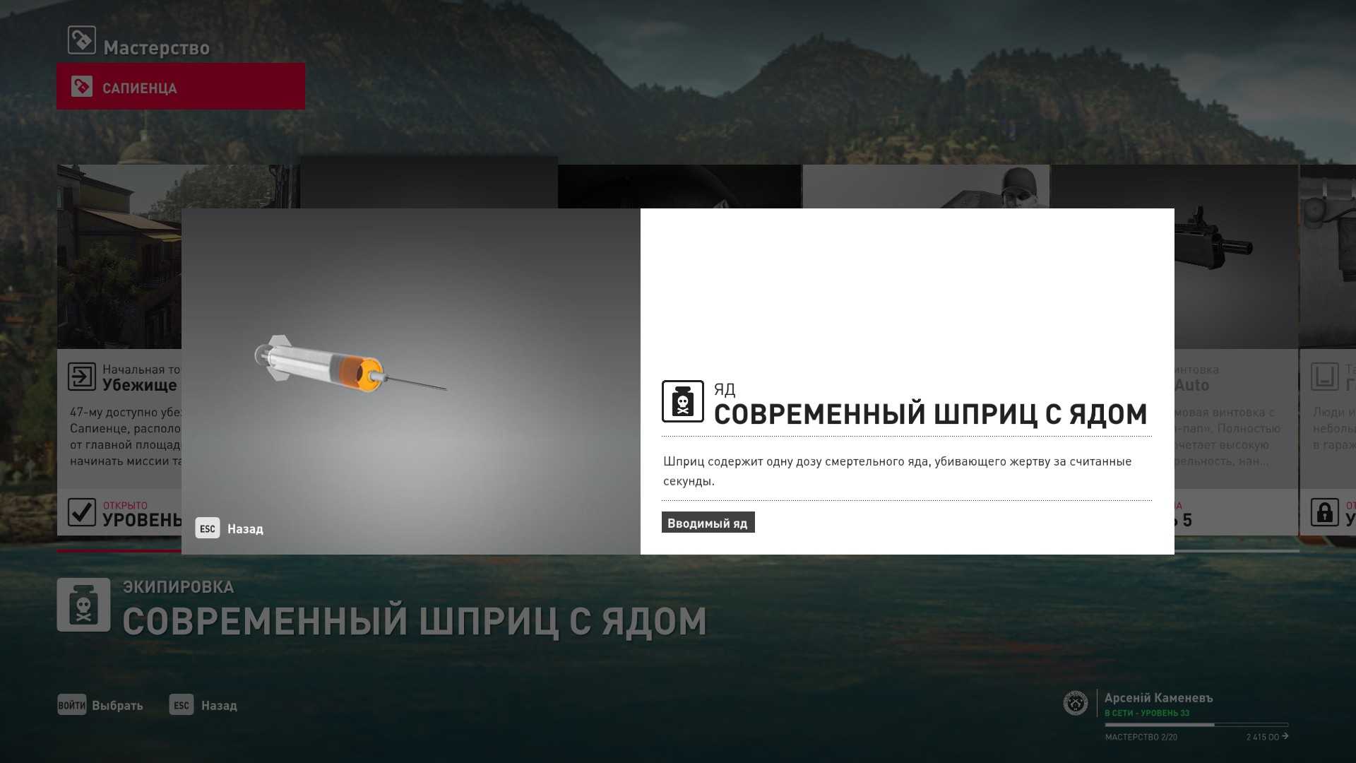 19 уровень мастерства: Тайник МКА в полевой лаборатории “Итер” 20 уровень мастерства: Снайперская винтовка Jaeger 7 Lancer и латунный шприц с рвотным ядом