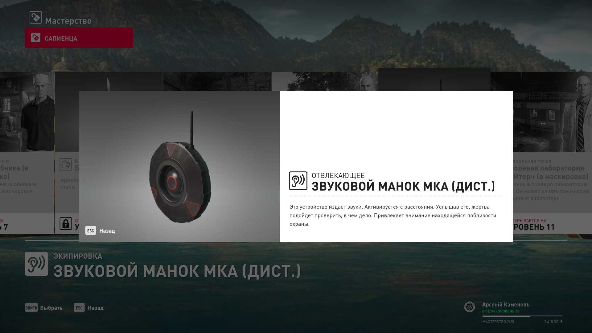 10 уровень мастерства: Звуковой манок МКА 11 уровень мастерства: Начальная точка в лаборатории “Итер” в маскировке лабораторного работника