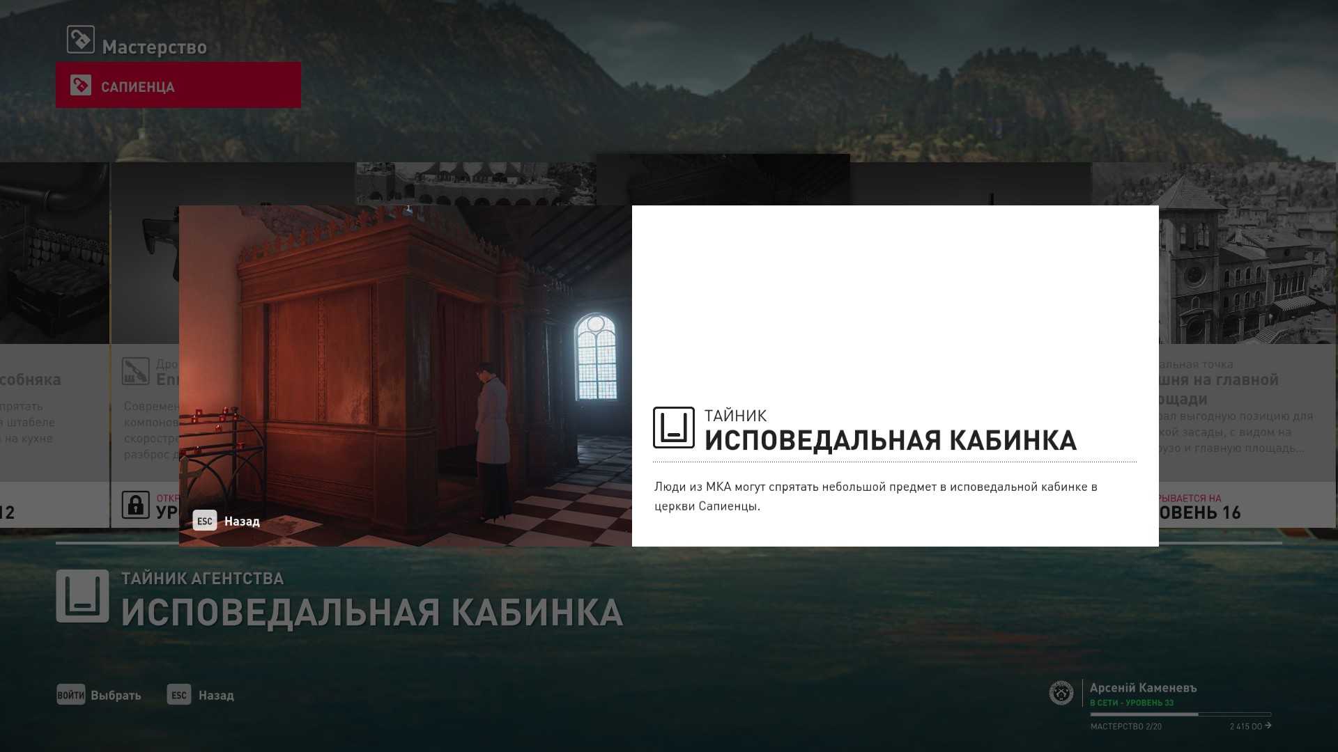 13 уровень мастерства: Начальная точка в гавани 14 уровень мастерства: Тайник МКА в исповедальной кабинке