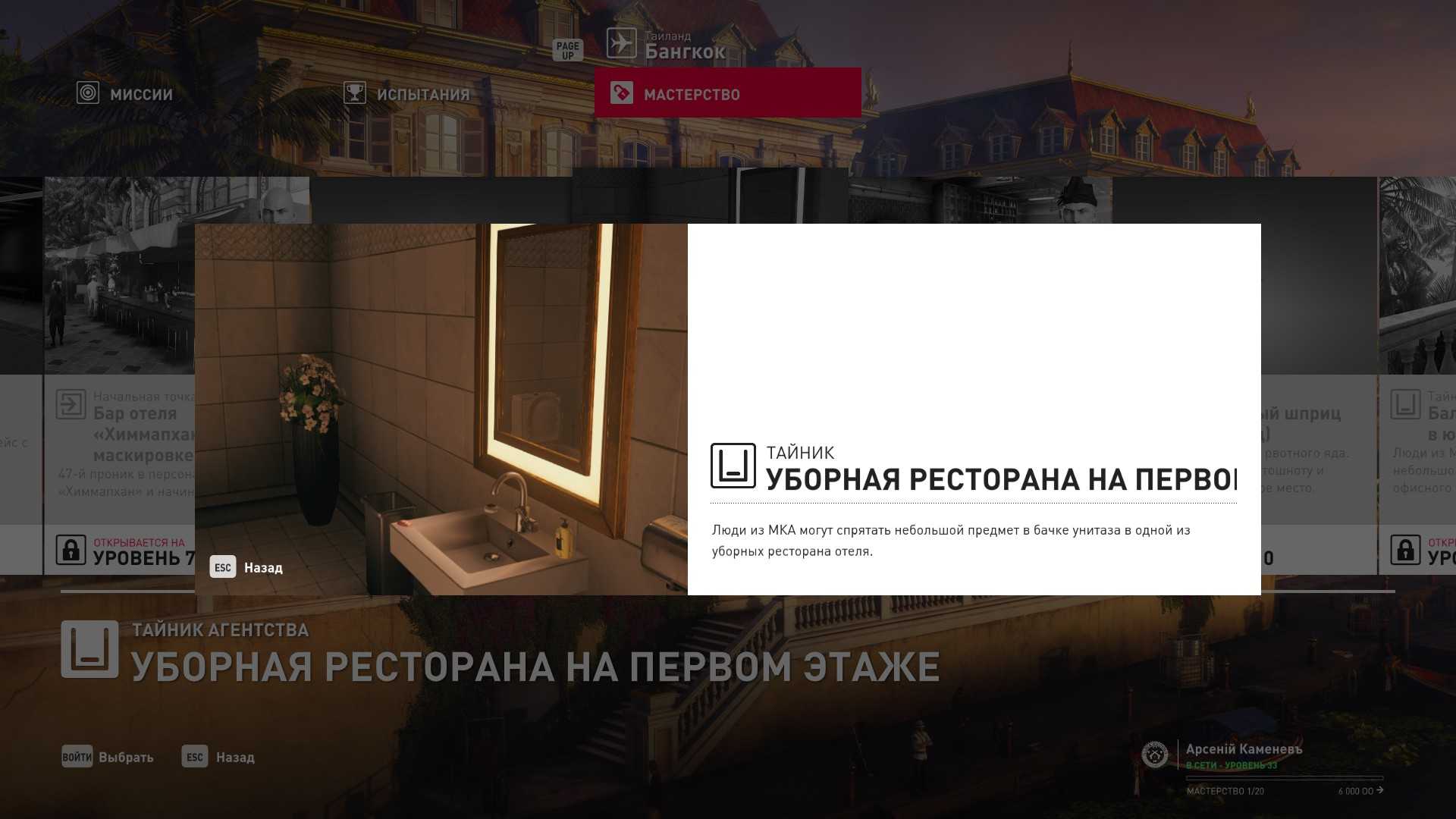 8 уровень мастерства: Тайник МКА в уборной ресторана на первом этаже 9 уровень мастерства: Начальная точка на кухне ресторана отеля “Химмапхан” в маскировке шеф-повара