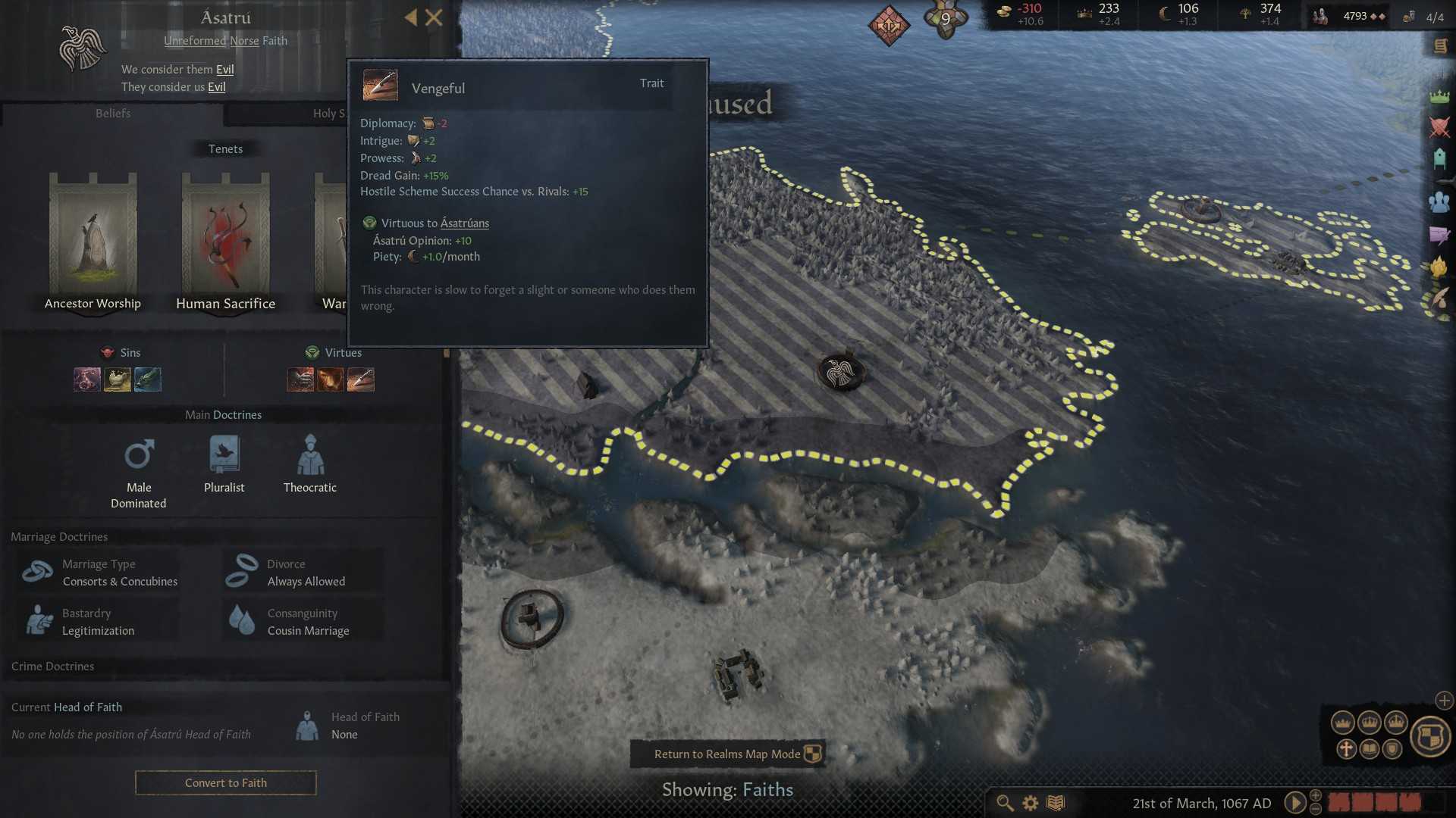 Веры, у которых есть Великие священные войны, такие как христианские крестовые походы или мусульманские джихады, скорее всего, будут бороться изо всех сил, чтобы защитить эти места. Однако, в отличие от Crusader Kings 2, наличие всех ваших святых мест не обязательно делает вашу веру более привлекательной. Фактически, их потеря может усилить пыл веры, поскольку верующие воодушевлены и мотивированы вернуть ее. Если вы создадите новую ересь существующей религии, ваши святые места будут такими же, как и у них, давая понять, что в регионе достаточно места только для одного «истинного» исповедания.