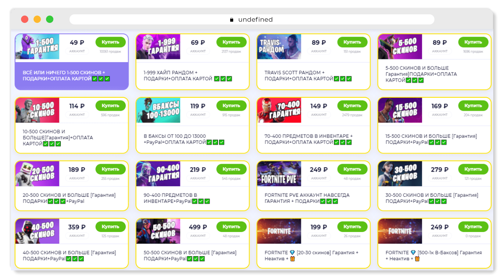Вокруг игры Fortnite, с аудиторией геймеров около 10 млн, уже давно сформировался черный рынок. Хакеры взламывают аккаунты и продают либо сами аккаунты, либо их ценные предметы. Цены могут колебаться от 50 центов до сотен долларов, в зависимости от ценности.