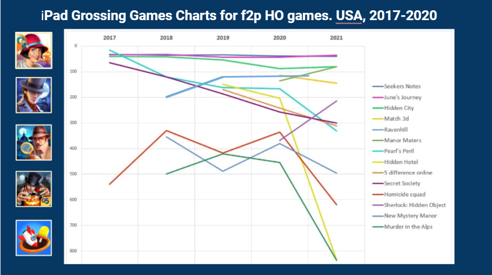 В 2017-2020 годах три игры жанра f2p HOPA держат позиции в рейтингах топ-100 Grossing Games: June’s Journey, Seekers Notes и Hidden City.