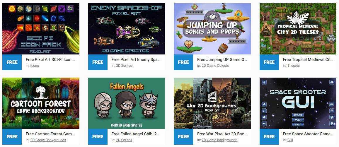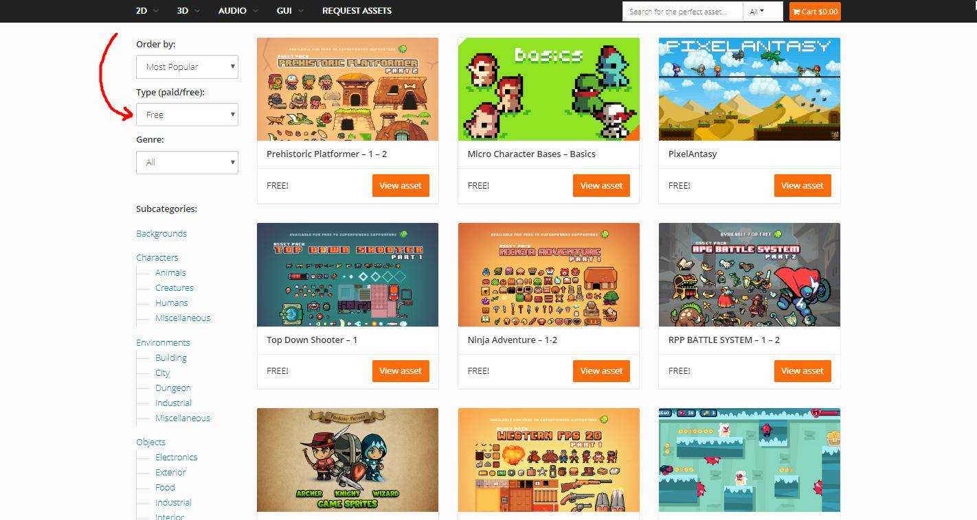 GameDevMarket — ярмарка ресурсов, созданных пользователями. Есть и уютный уголок «халявы». Чтобы попасть туда, откройте интересующий раздел (например, 2D > Characters) и в колонке слева выберите Type > Free.