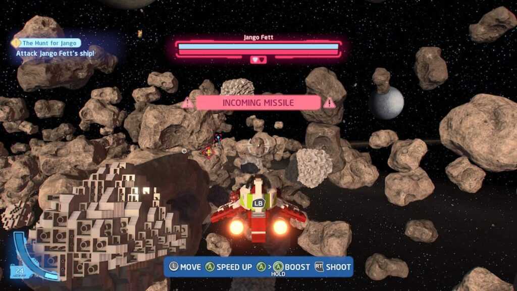 Пока на охоте Джанго Фетт в космосе игрокам нужно будет уклоняться от три входящих ракетных удара заставив их корабль выполнить бросок, чтобы завершить это испытание.