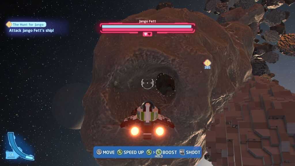 Для последнего испытания уровня в «Охоте на Джанго» игроки должны проехать через огромный астероид, не разбиваясь. Чтобы сделать это, избегайте слишком быстрого ускорения с ускорением и вместо этого двигайтесь медленно по узким коридорам.