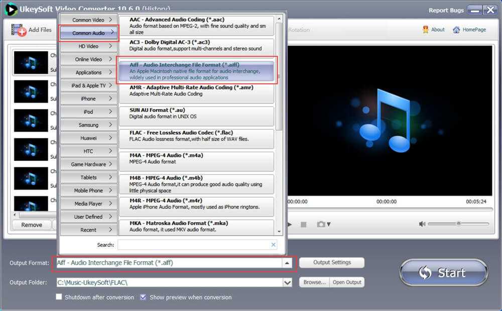 Щелкните раскрывающийся список «Формат вывода», перейдите к «Общее аудио», затем выберите «AIFF — Формат файла обмена аудио (* .aiff)» в качестве выходного формата. AIFF — это собственный формат файлов Apple Macintosh, который широко используется в профессиональных аудиоприложениях. Если вы хотите преобразовать FLAC в другие аудиоформаты, поддерживаемые iTunes, например MP3, WAV, AAC, ALAC (.m4a), их можно легко найти, перетащив полосу прокрутки.