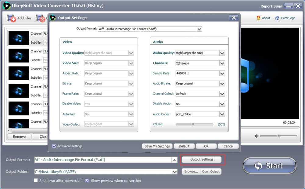 Советы: Если вы хотите изменить частоту дискретизации звука на выходе и звуковые каналы, пожалуйста, нажмите «Настройки вывода».