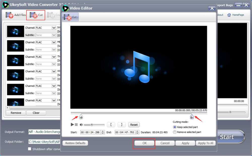 Программное обеспечение поставляется со встроенной функцией редактирования видео / аудио. Если вы хотите вырезать аудиофайл, выберите его и нажмите кнопку «Вырезать», появится новое окно редактирования.