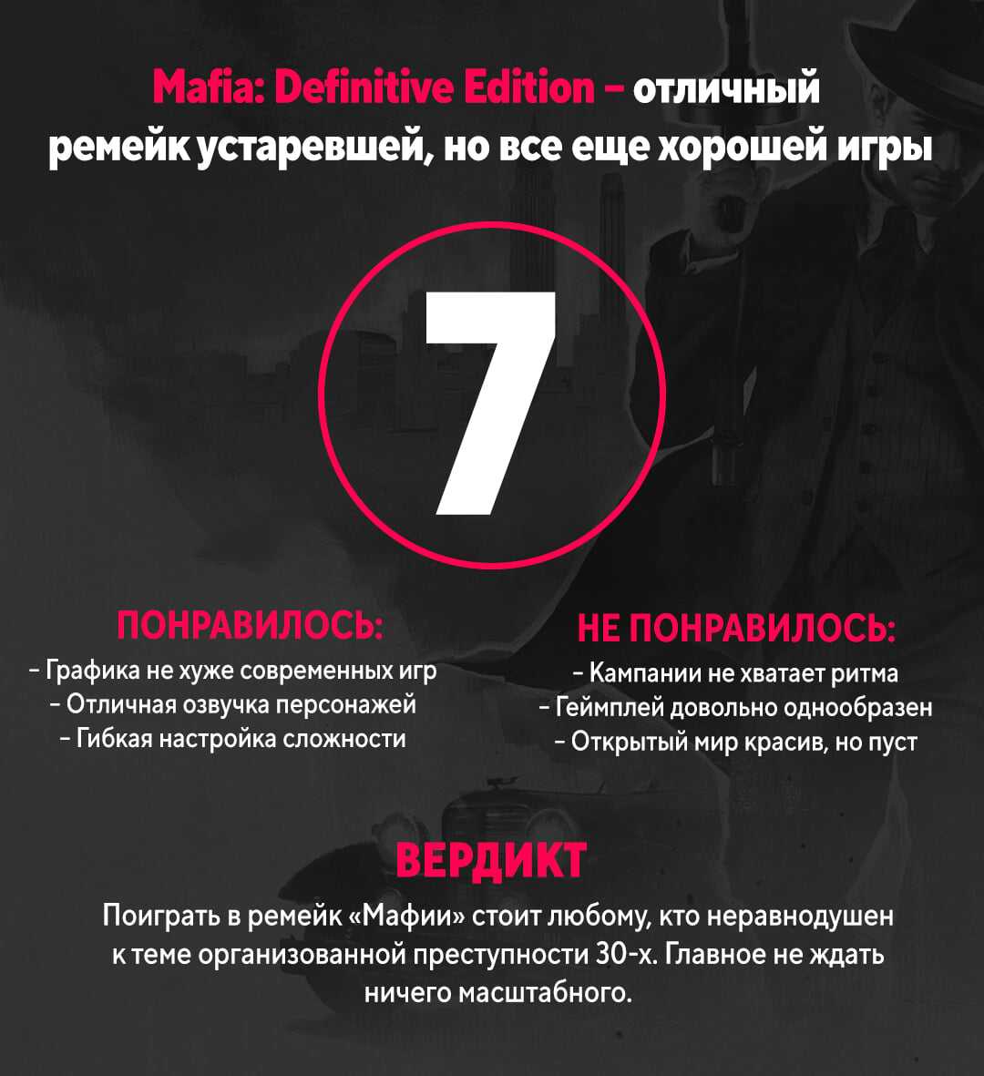 Mafia: Definitive Edition – один из тех объективно классных ремейков, которые хочется ругать за вещи, относящиеся к оригиналу, а такая критика в целом некорректна. Тем не менее я советую игру либо ностальгирующим фанатам, либо тем, кто настроен на марафон серии. Потому что впечатления от игры как от отдельной единицы могут оказаться не негативными, но какими-то неполноценными.