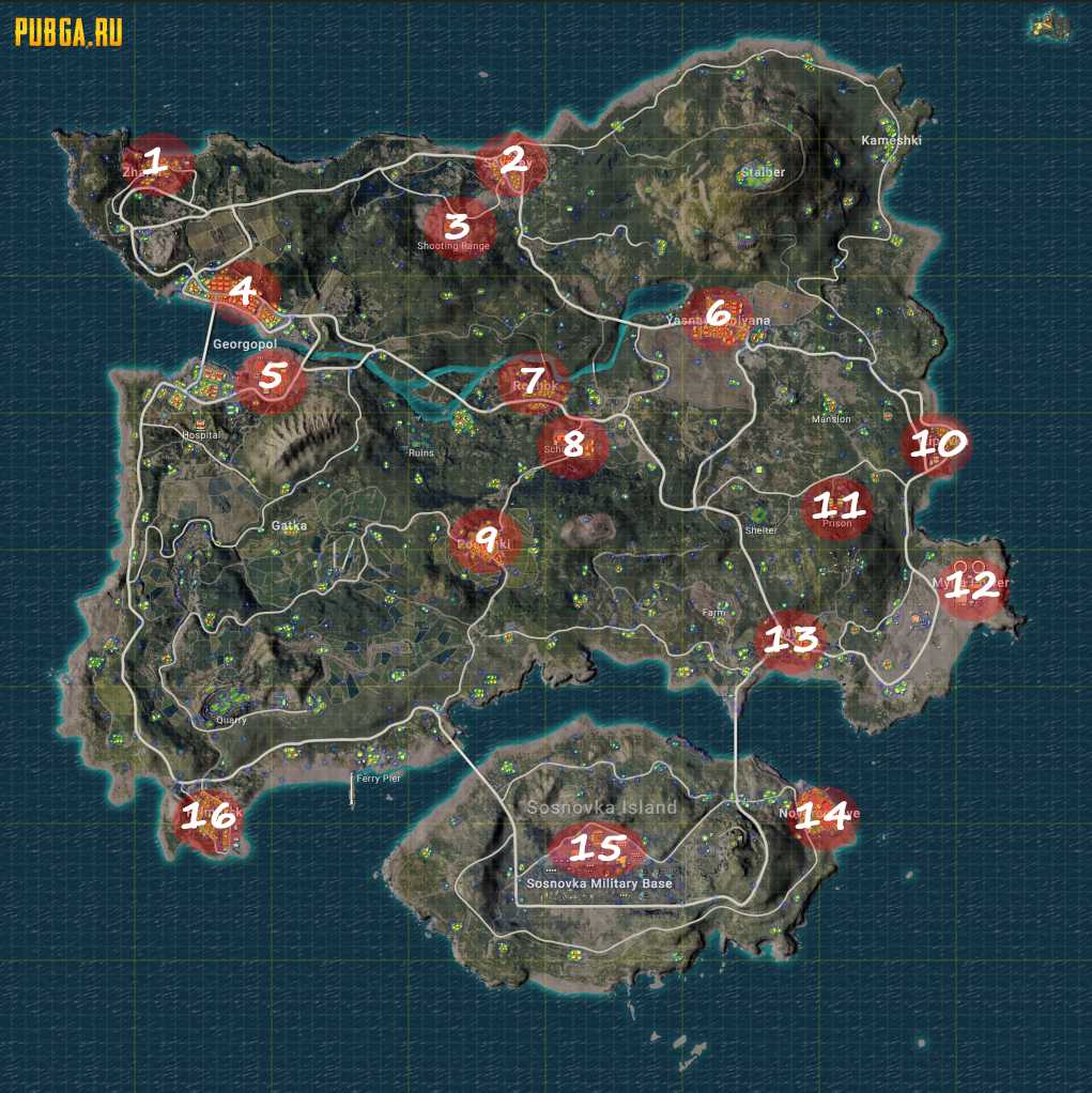 Данные предоставлены на основе игрового опыта автора, а так же интерактивной карты pubgmap.io.