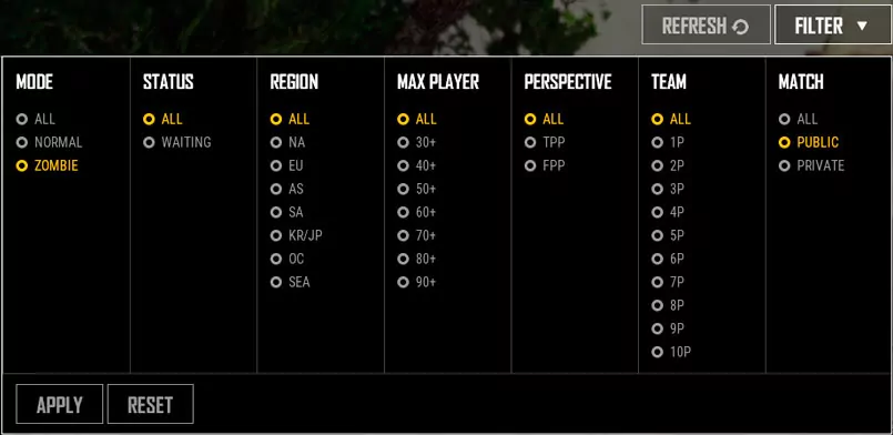 - Оптимальные настройки для остальных колонок выставлены на картинке. Везде нужно ставить «All», потому что зомби серверов в PUBG не так много, так что привередничать и выбирать регион или количество игроков вам не пристало. А вот выбрать «Public» матч — это обязательно, потому что приватные игры закрыты паролем и вас туда никто не пустит.
