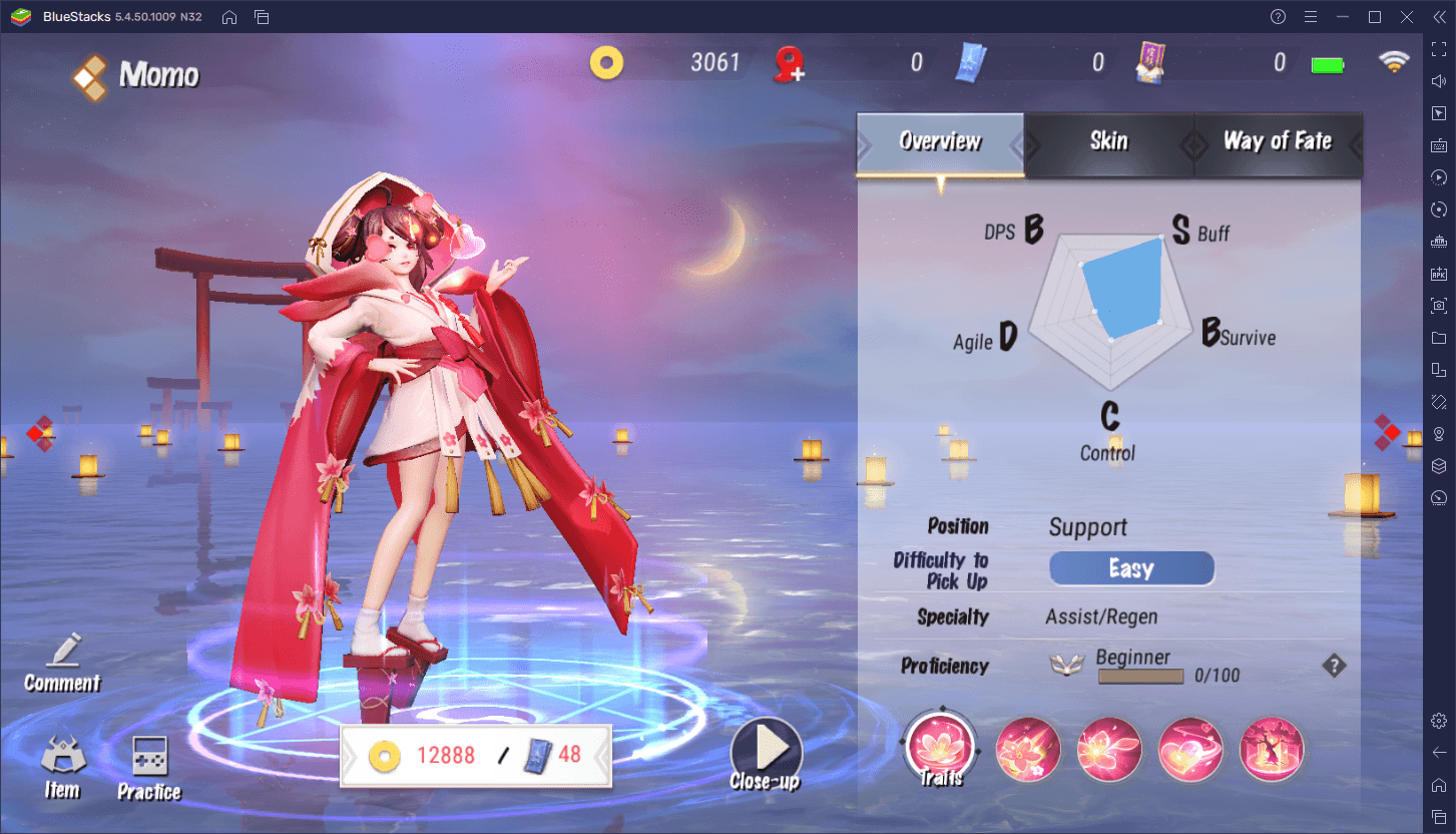 Саппорт Момо может стать отличным помощником стрелка. Она не даёт противнику передышки, подлечивает и делает все, что нужно на своей позиции. Момо даже может воскрешать павших персонажей, удерживая их в бою, даже если враг сосредоточился на них. Когда все стоят на своих линиях («лайн фаза») она также превосходно выводит врагов из строя.