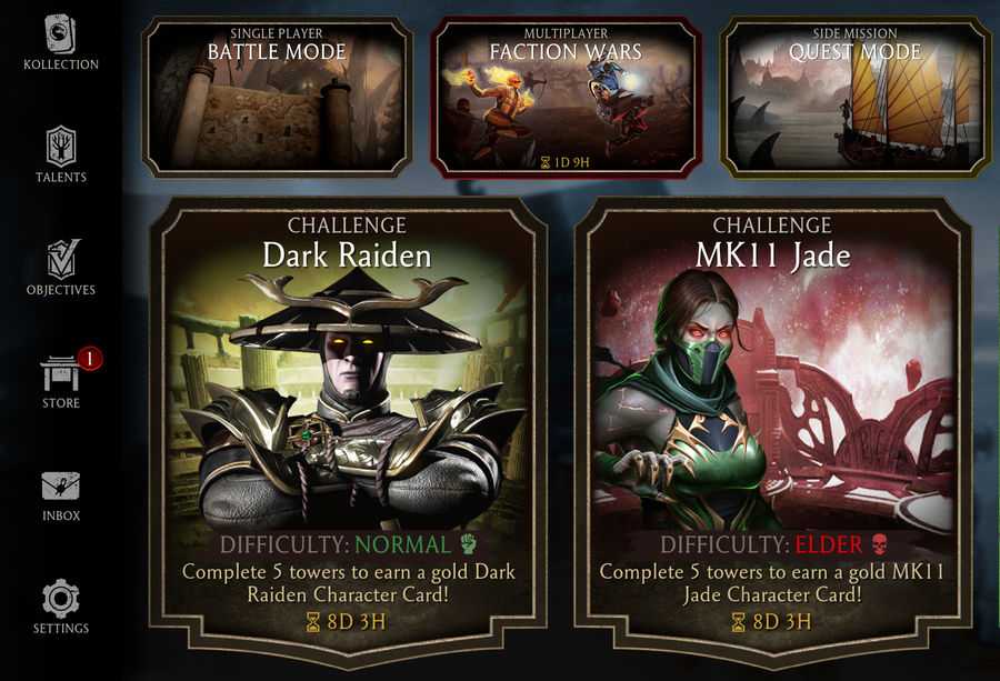 Режимы и карты. В игре есть несколько режимов и несколько карт. Например, Башня Шао Кана, за которую игрок повышает уровень и навыки персонажей. Примерно на 80-ой битве игрок получает осколки душ, за которые можно купить карту в режиме «Охота за реликвиями» после прохождения карты которой, даёт доступ к самому Шао Кану.
