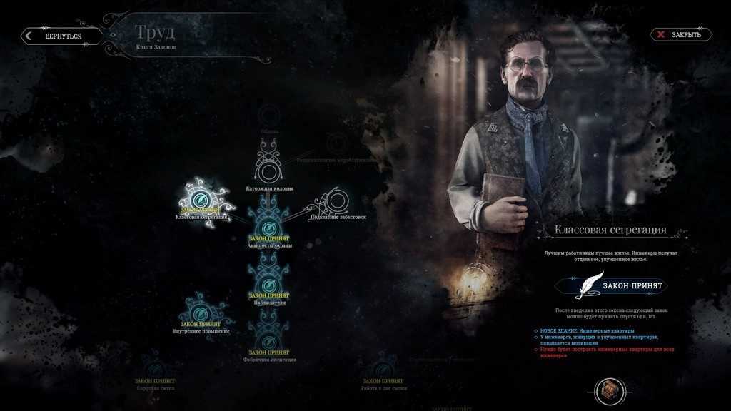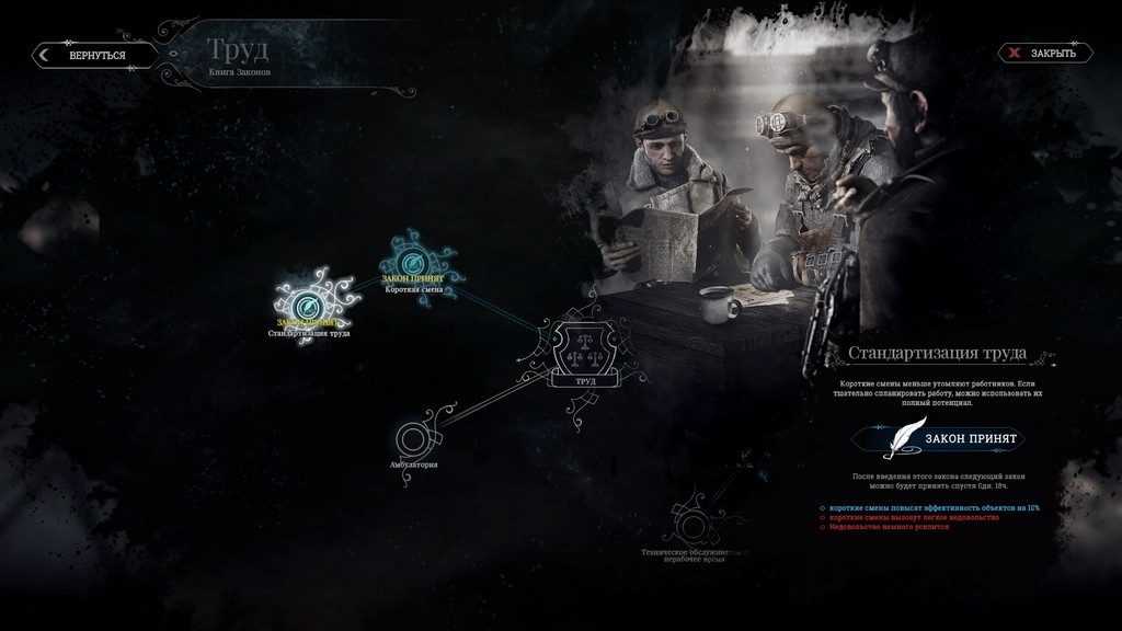 Когда вы создадите несколько конструкционных профилей, произойдет отравление на стройплощадке, после которого откроются законы труда. Законы для данного этапа: Короткая смена→Техника безопасности→Работа в две смены→Координация рабочих смен→Стандартизация труда→Кулачные бои. Короткую смену используйте на всех объектах стройплощадки, а работу в две смены во всех остальных зданиях города. Когда наступит вечер 11 дня или шахтный ствол будет готов на 60%, распустите оттуда рабочих и дождитесь снижения уровня газов на 13 день. За эти 2 дня вы накопите много ресурсов, которые сильно помогут в будущем. Также постройте в этот период вентиляционную установку. После снижения уровня газов и продолжения строительства, на 70% произойдет взрыв. Благодаря уровню безопасности Вредно будет доступен вариант Отправить спасателей и прогресс строительства не будет потерян. Чуть позже произойдет первая забастовка, после которой нужно выбрать приоритетный класс людей. В следующих разделах руководства будут рассмотрены только те законы, которые не ведут к радикальным концовкам и неизбежным жертвам.