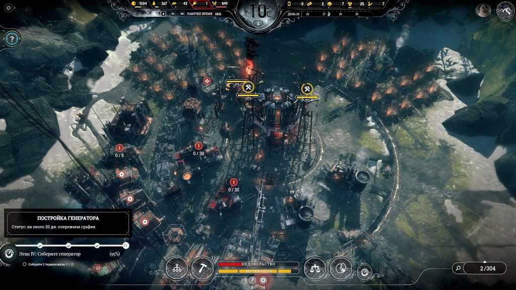 - Эффективное использование короткой смены. После завершения короткой смены, отправляйте рабочих на городские здания с 24-часовым режимом, а на утро возвращайте людей на стройплощадку. Такой график позволит добывать много ресурсов, не жертвуя скоростью строительства генератора.