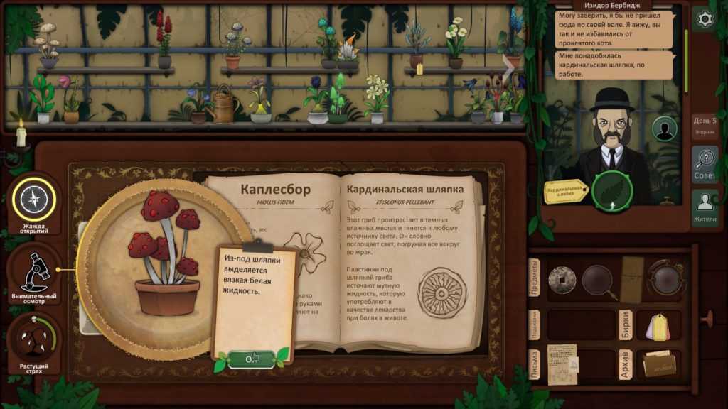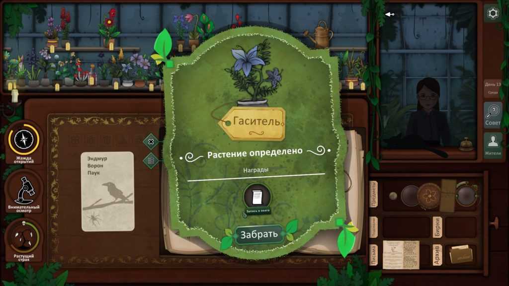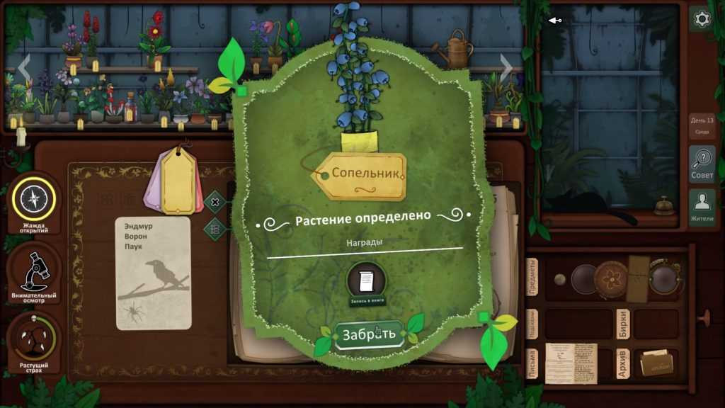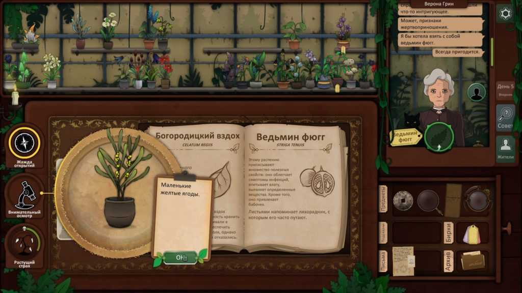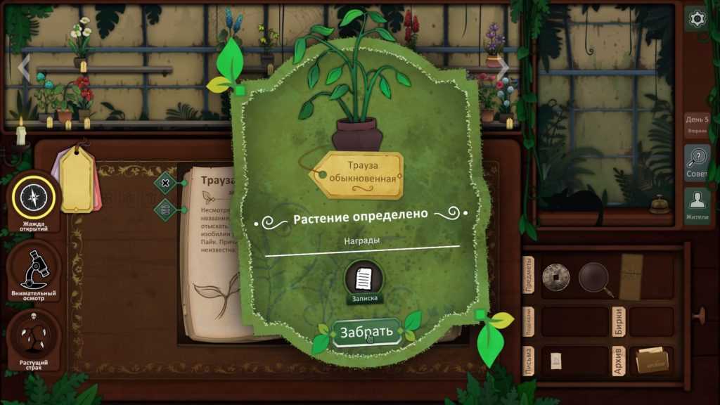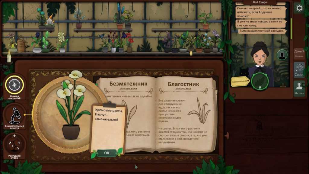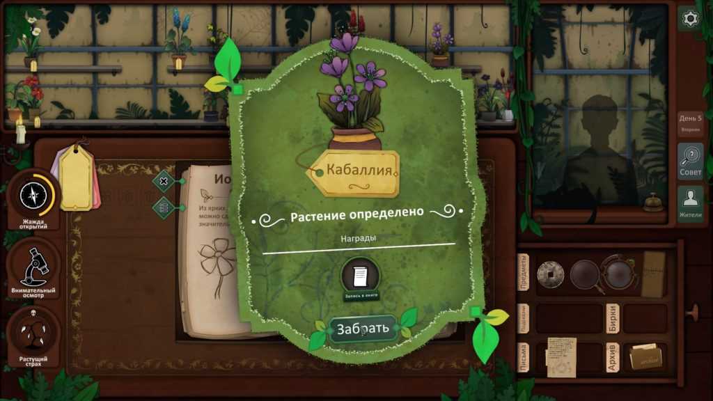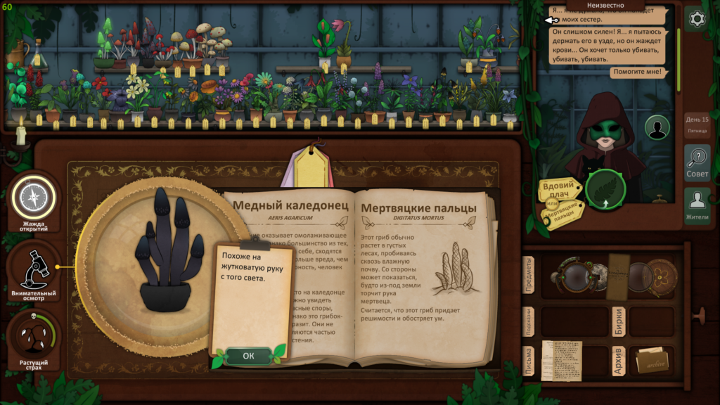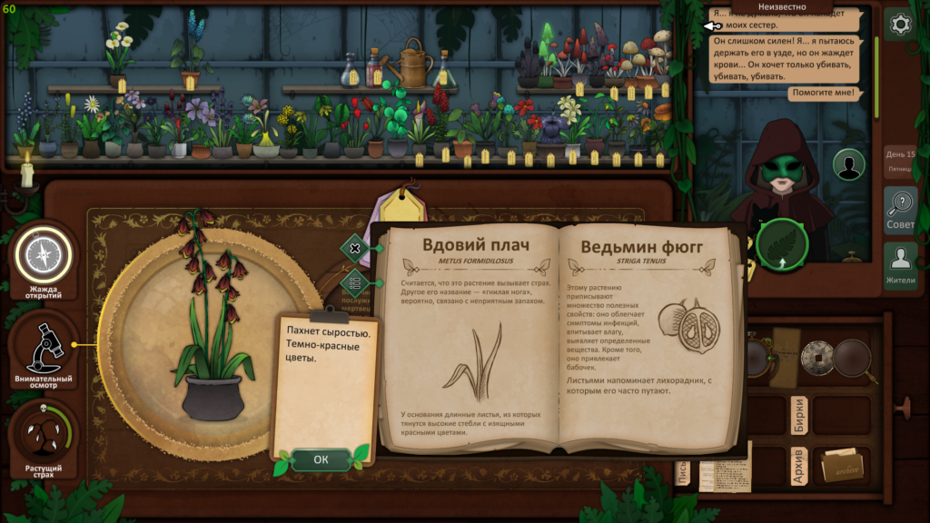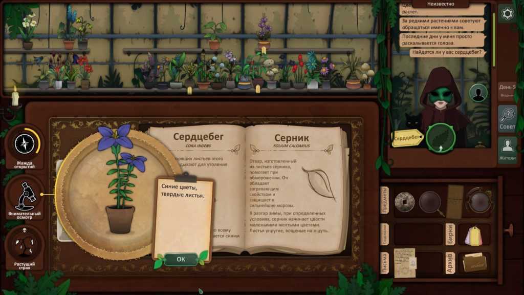 Пришло время использовать наши пять растений, чтобы провести ритуал и, надеюсь, связать существо. Используйте загадку со дна шкатулки, чтобы выяснить, какие растения вам нужны. Друг мертвеца — дьявольский колпак, жвала капкана ловца — долгосват, страха будитель — вдовий плач, скромница длинная снимет порчу, а из крови мрак изгоняет — эльдерфиниум.