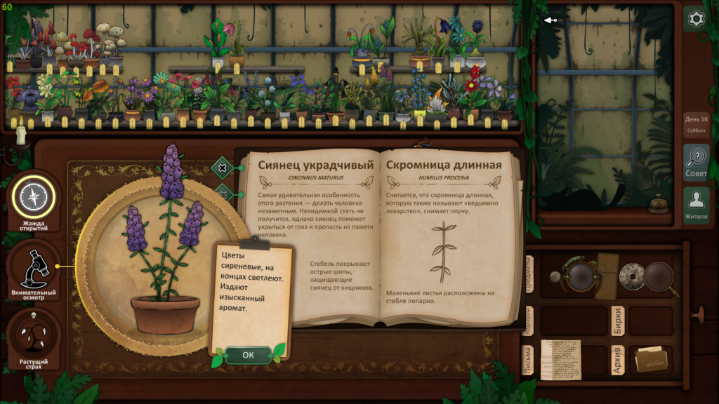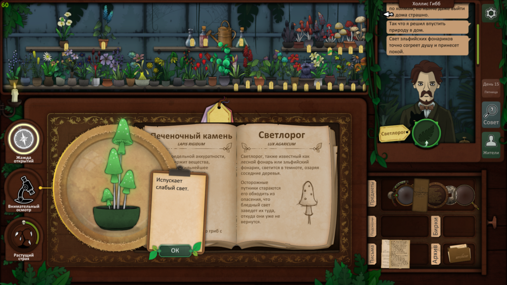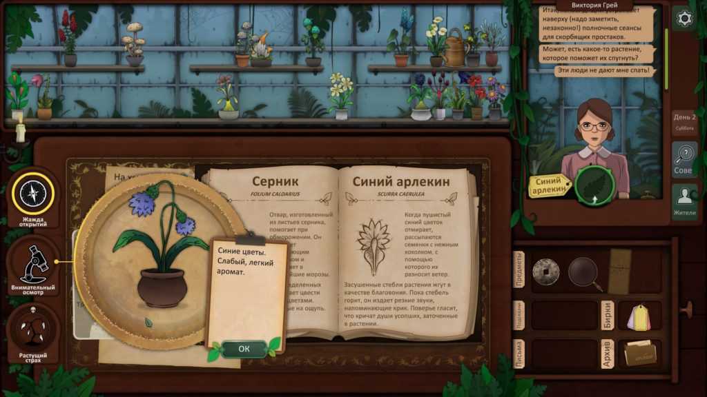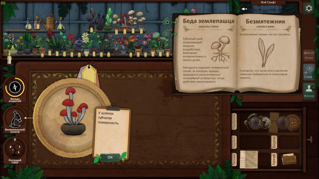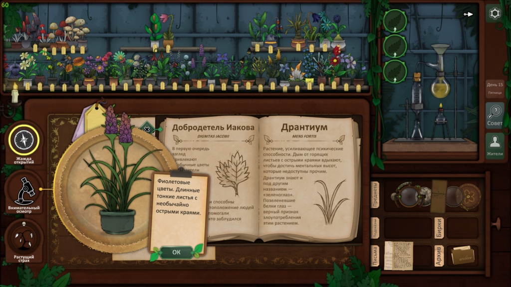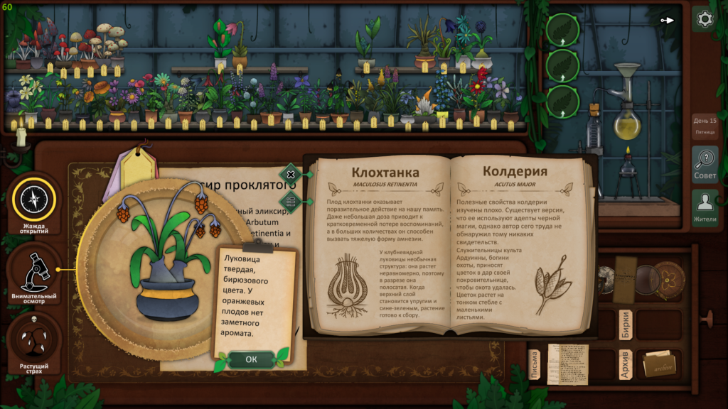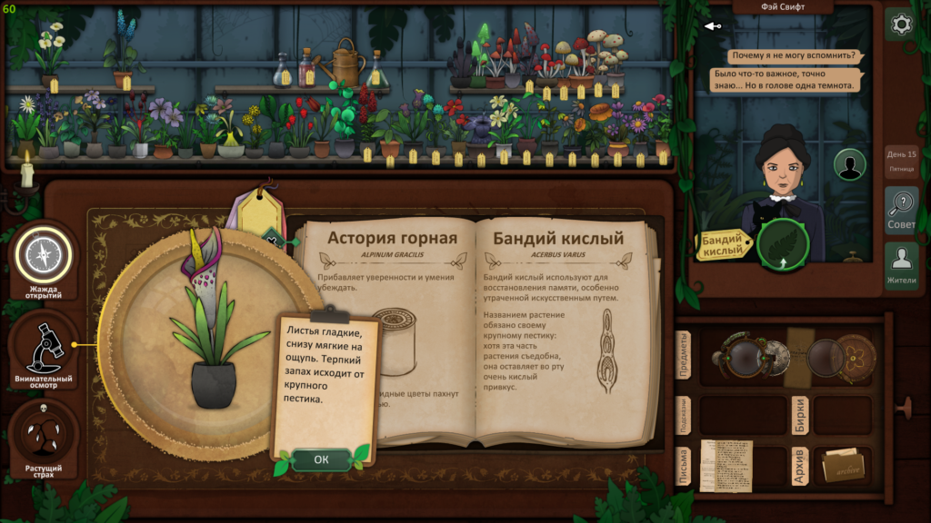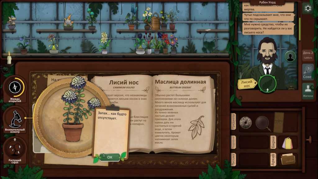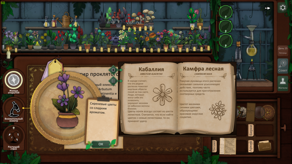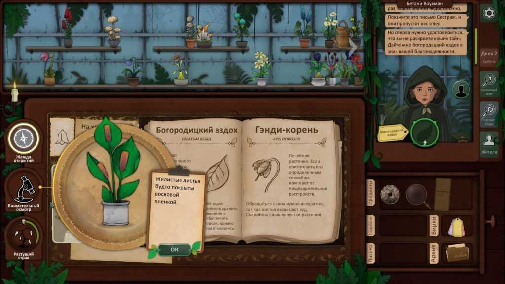 Пришло время использовать наши пять растений, чтобы провести ритуал и, надеюсь, связать существо. Используйте загадку со дна шкатулки, чтобы выяснить, какие растения вам нужны. Друг мертвеца — дьявольский колпак, жвала капкана ловца — долгосват, страха будитель — вдовий плач, скромница длинная снимет порчу, а из крови мрак изгоняет — эльдерфиниум.