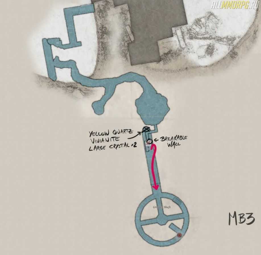 Оказавшись внизу, обернитесь. Там есть дыра в стене. Взорвите ее с помощью самодельной взрывчатки и соберите два огромных кристалла, желтый кварц и вивианит. Потом выходите из комнаты и проходите в ворота в конце коридора.
