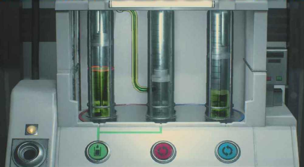 Использование вышеуказанных кодов разблокирует станцию синтеза препаратов (Drug Synthesis Station). Теперь вы можете положить туда картридж с раствором (Dispersal Cartridge) и начать синтез гербицидов (Herbicide Synthesis). На машине есть 3 цветные кнопки, следуйте приведенным ниже инструкциям из исходного положения. Если вы уже пробовали решить головоломку самостоятельно, то решение не сработает, поскольку ваши положения пробирок будут отличаться от значений по умолчанию. Если вы еще не нажали какие-либо кнопки, то вы сможете скопировать приведенное ниже решение. Цель состоит в том, чтобы заполнить один картридж до красного кольца. Каждый из 3 картриджей имеет разные максимальные уровни заполнения. Вы можете заметить, что каждый картридж имеет разную высоту. Только средний и большой может вместить достаточно жидкости, чтобы достичь красной отметки. Вы должны переместить зеленую жидкость между пробирками, чтобы получить разные объемы заполнения.