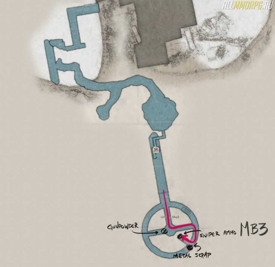 Идите вперед и поверните направо (на запад). Там вы найдете порох. Поворачивайте на восток и следуйте по дорожке направо. Заберите ржавые обломки и патроны для снайперской винтовки в ящике.
