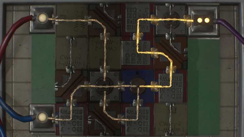 Как только все детали будут размещены, нужно будет решить головоломку, которая связана с электросхемой. Смысл данной головоломки заключается в том, что нужно провести ток от красного и синего провода до фиолетового провода. Решение головоломки на парковке в Resident Evil 2: Remake находится ниже.