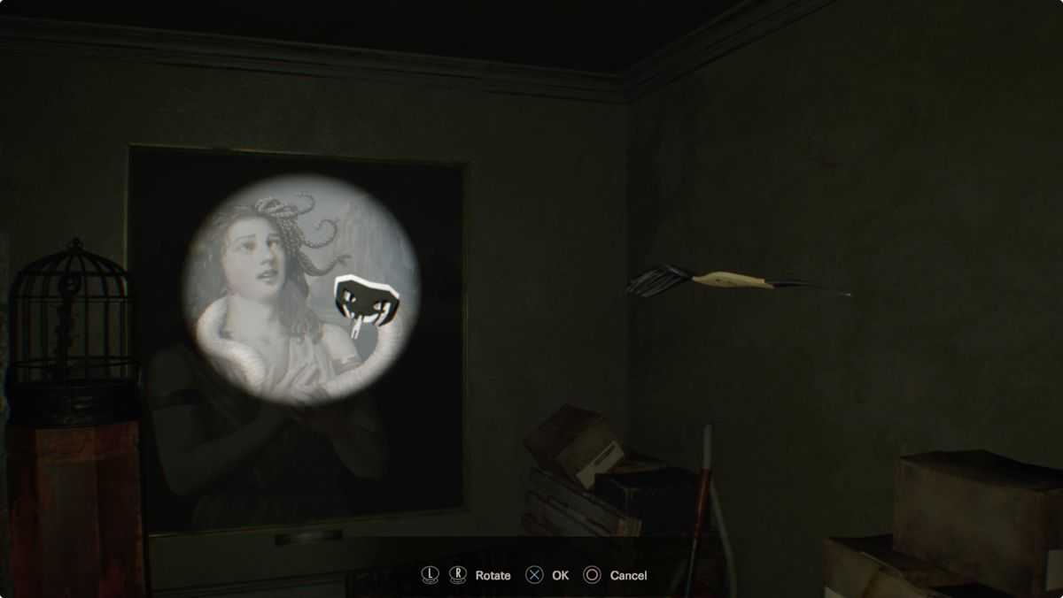 Combine lantern hooks A and B to create an iron statuette. Spin the statuette until its shadow matches up with the side of Medusa’s face. Now, you have to find something to cast the snake’s shadow. If only you had something with a picture of a snake on it.