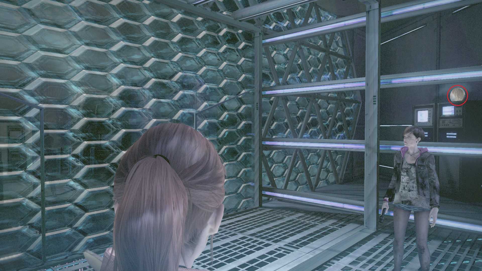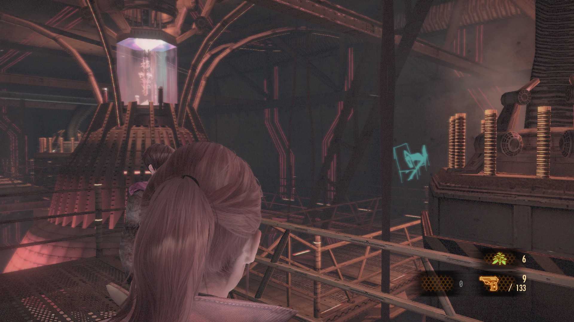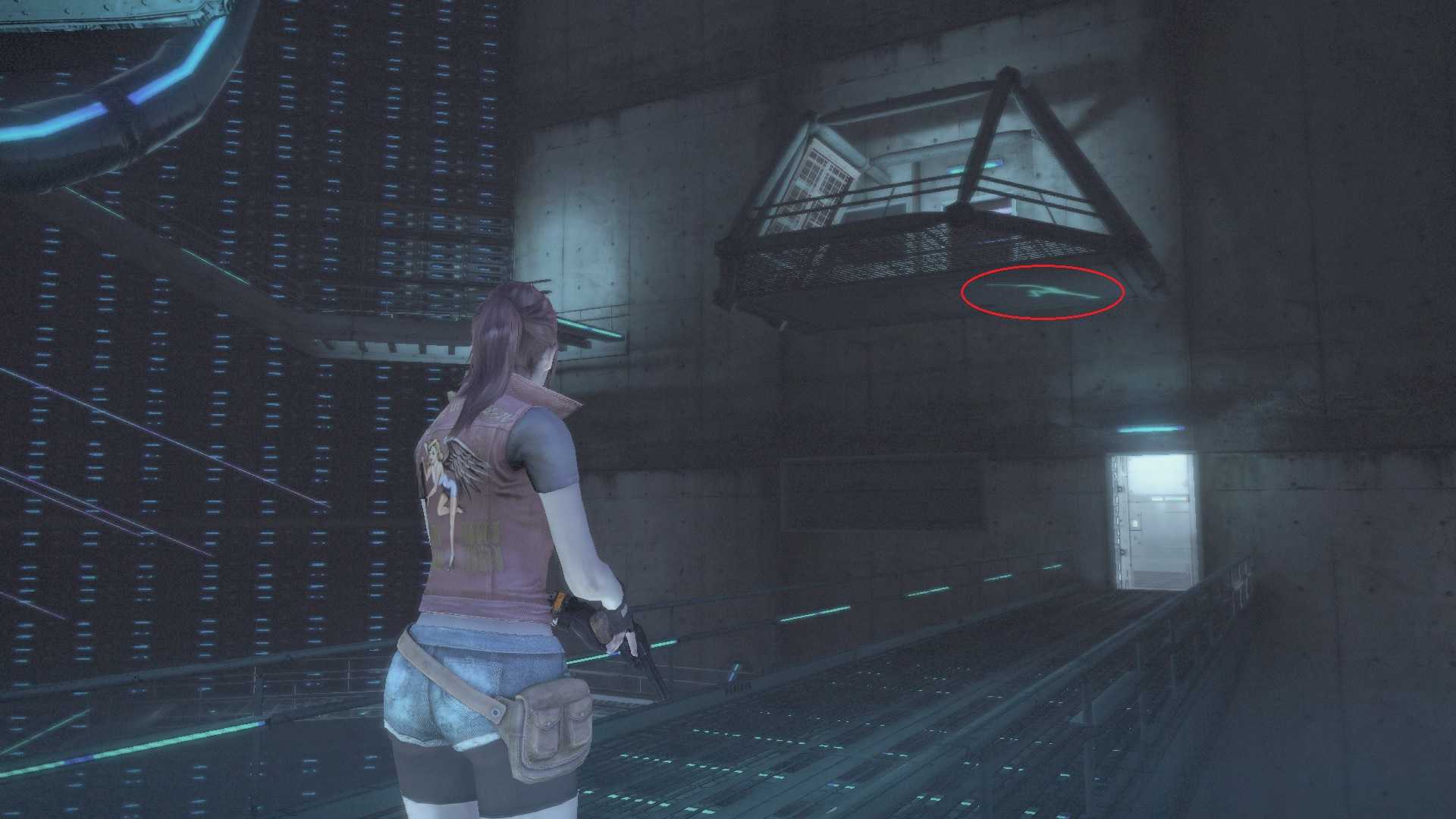 В помещении с управлением через окно замечаем Аду получившую ранение. С левой стороны стоит кассетный проигрыватель на столе, вставляем кассету и смотрим, как учёный превращается в монстра. Неподалёку находится Текст канализации, а на стене карта.