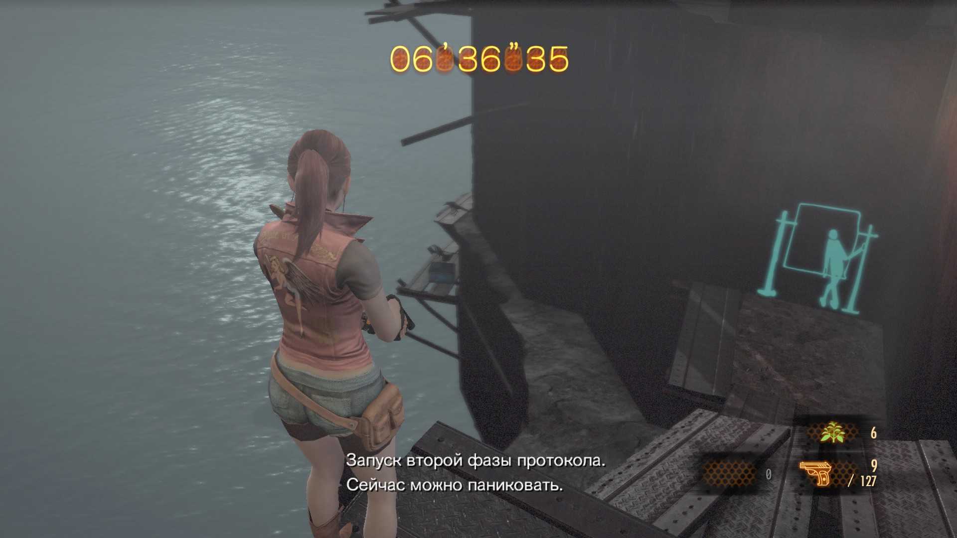 Леон приходит в себя, играем за него. Придётся идти по коридору, поскольку лестница, которая вела в трубу, разрушена. В лифте наверх. От комнаты спускаемся и прыгаем в воду.