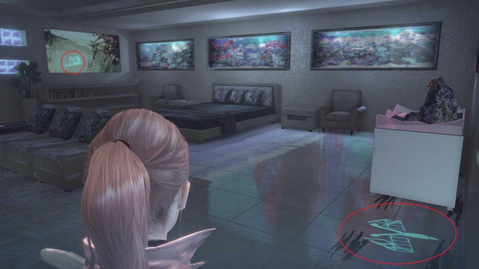 Рисунки Кафки (3/6): Попав в уютную комнату освещаем картину слева от кровати и пол под аквариумом. Эмблема башни (1/10): Опустим мост попадаем в комнату, где встречаемся с Алекс. Пока она болтает справа сбиваем эмблему.