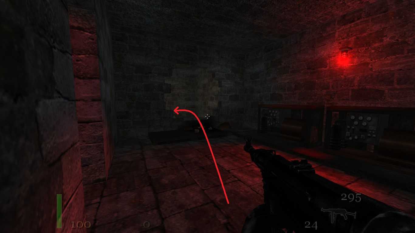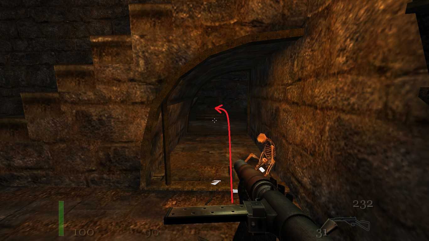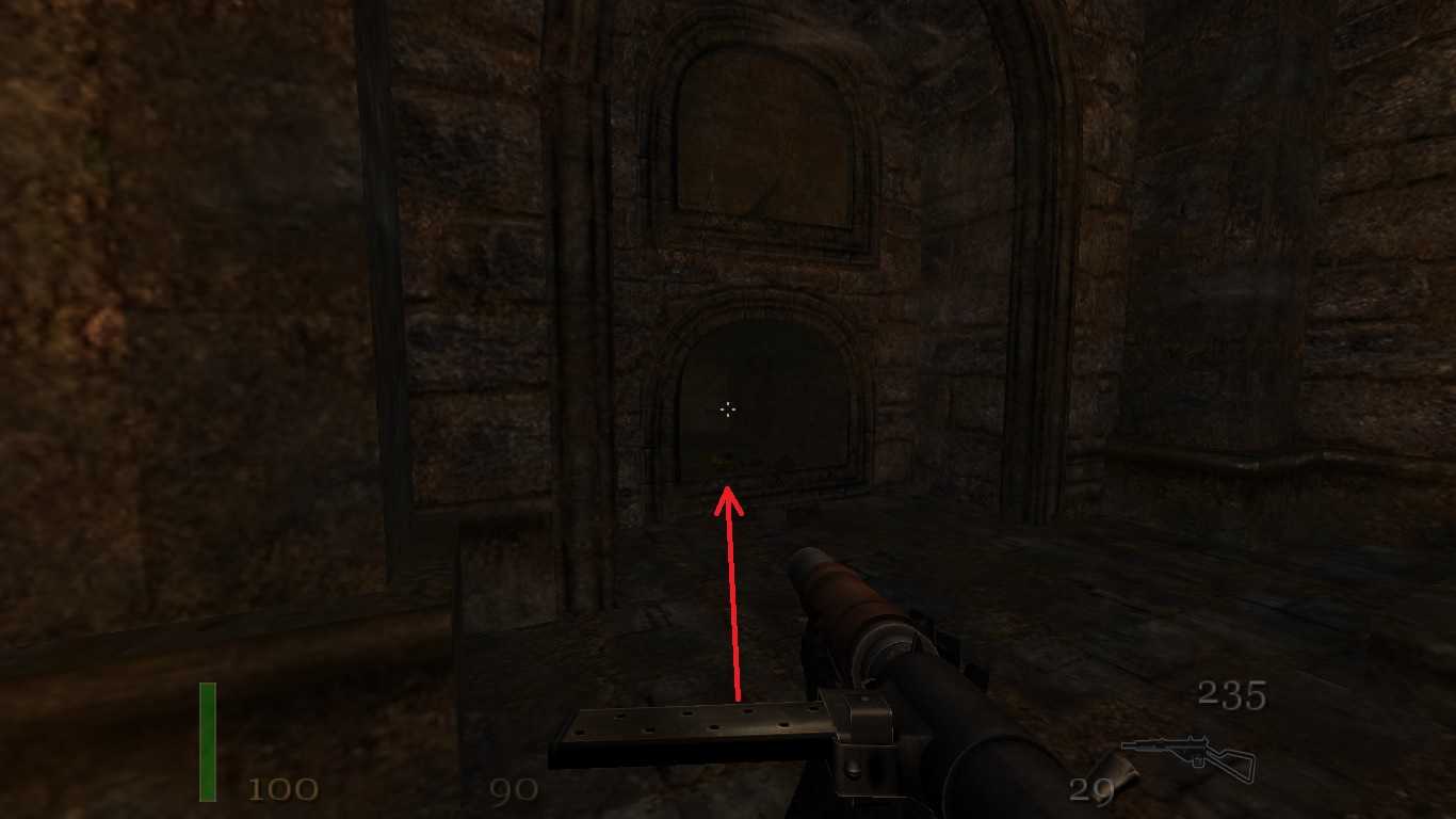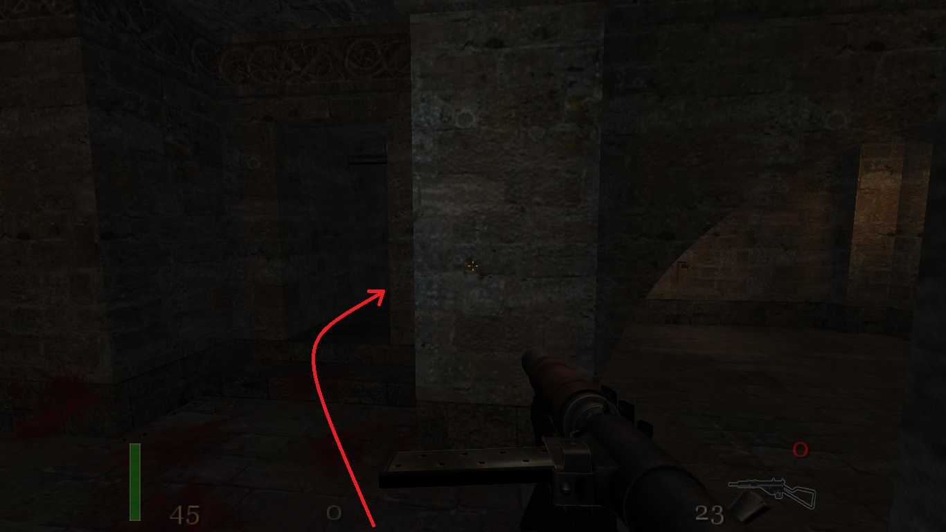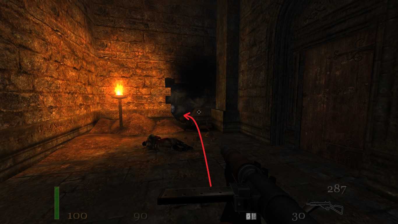 4:После победы над двома немцами, которые сделали дыру в потолке, прыгаем вниз и противоположно от двери есть арка заложенная кирпичами.