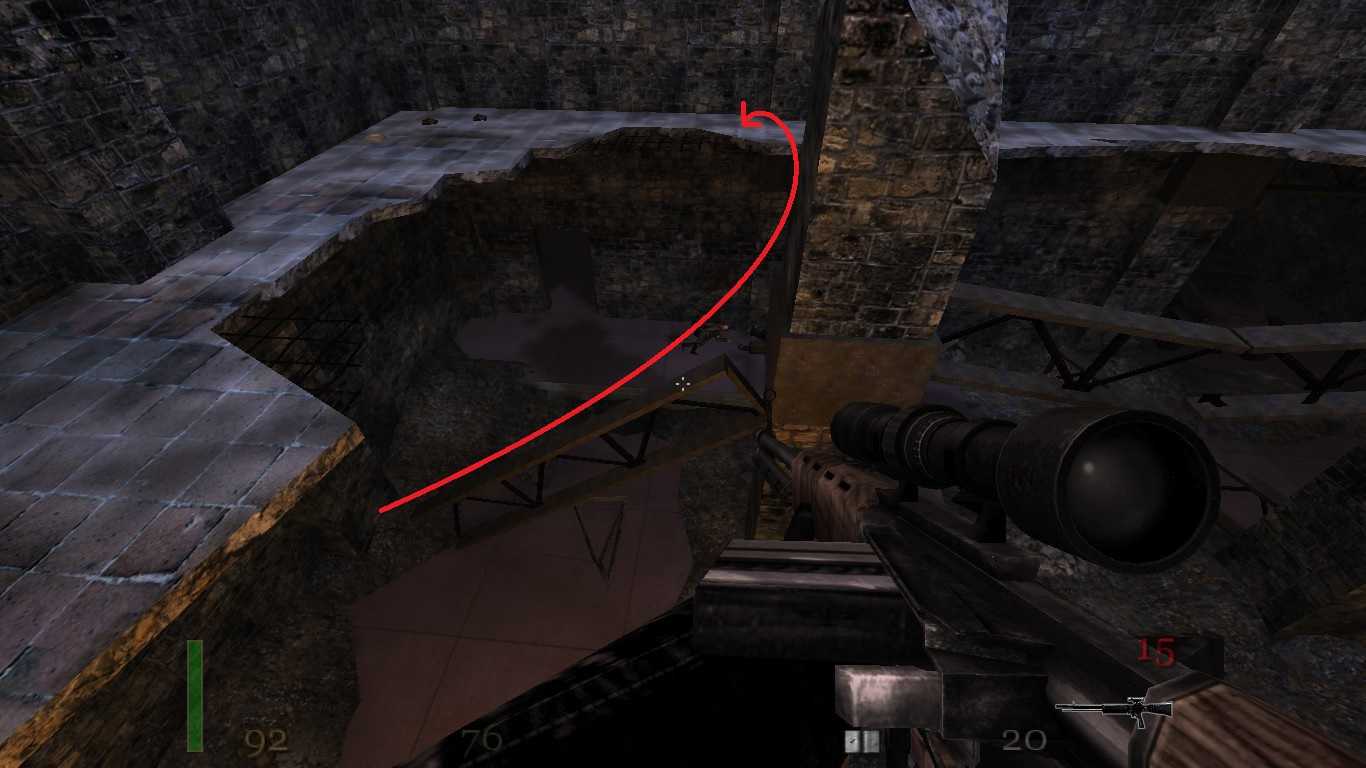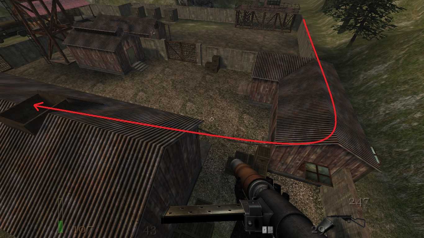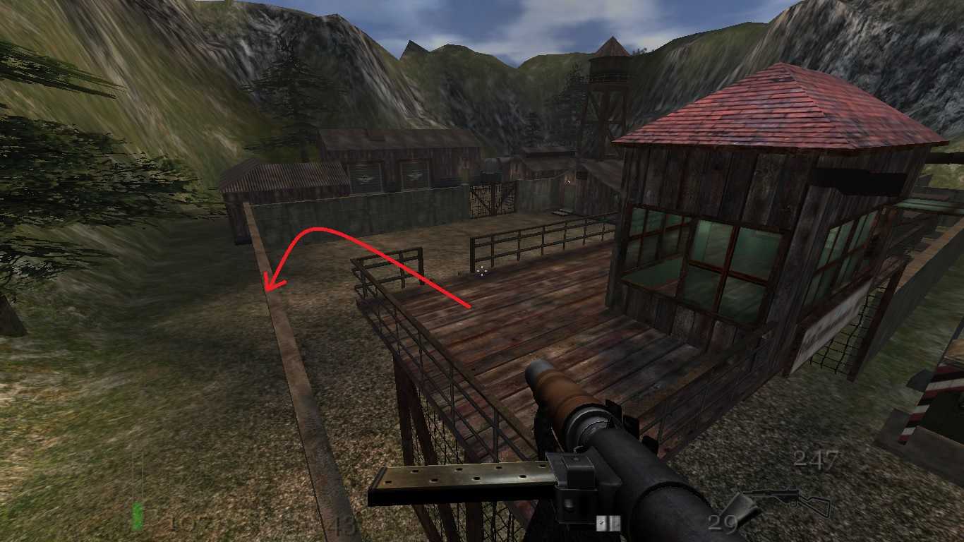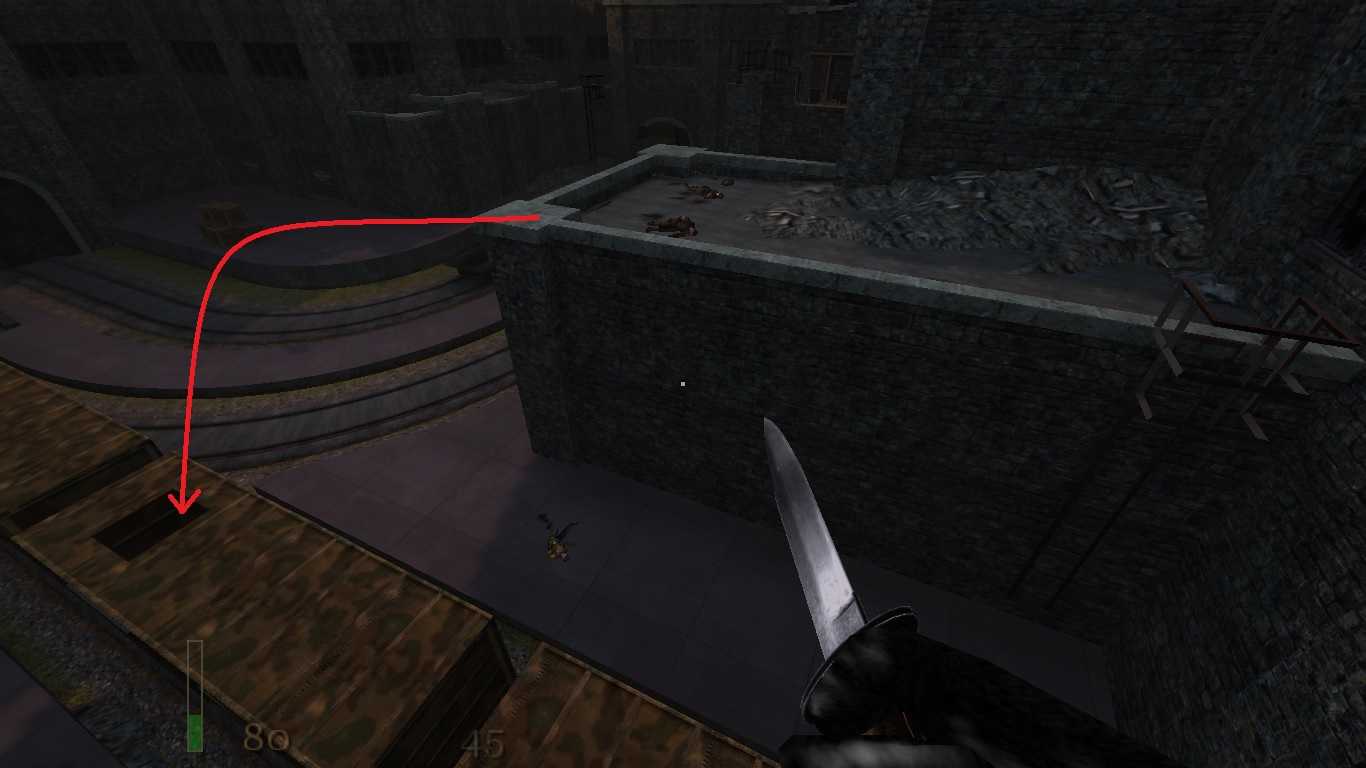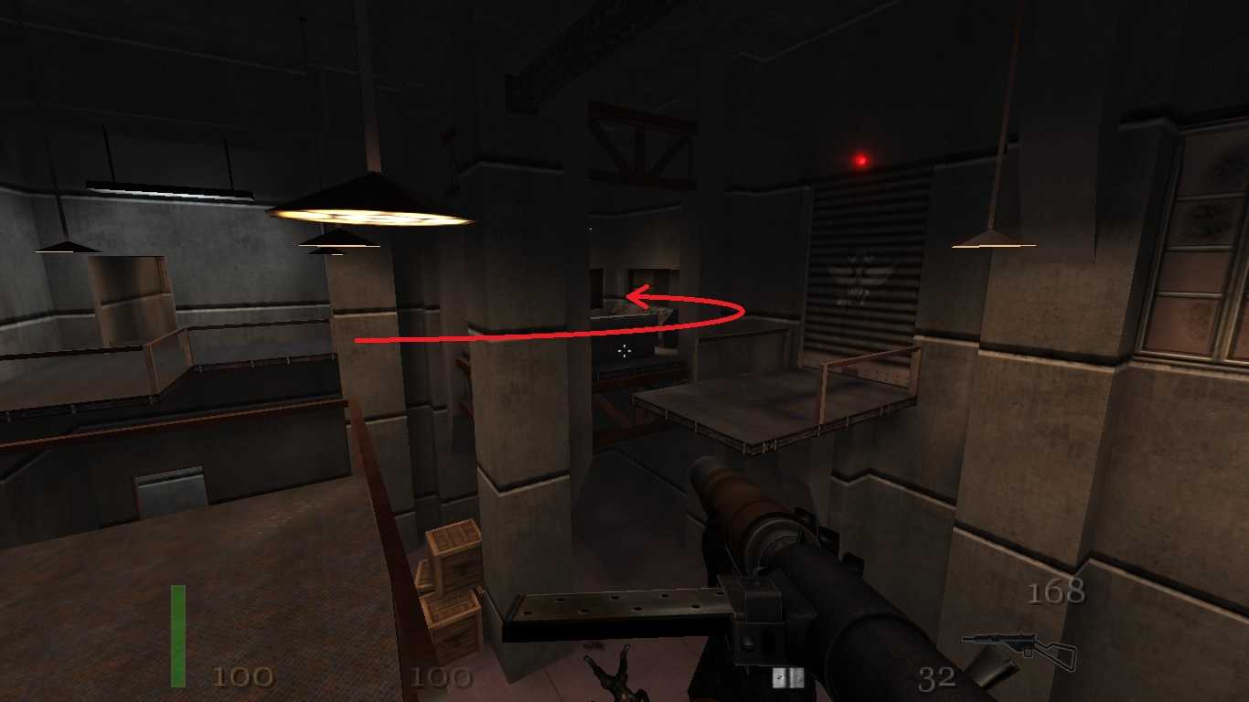 1:В конце карты есть железная балка. Запрыгните на ее. Сверху можно заметить часть от второго этажа.