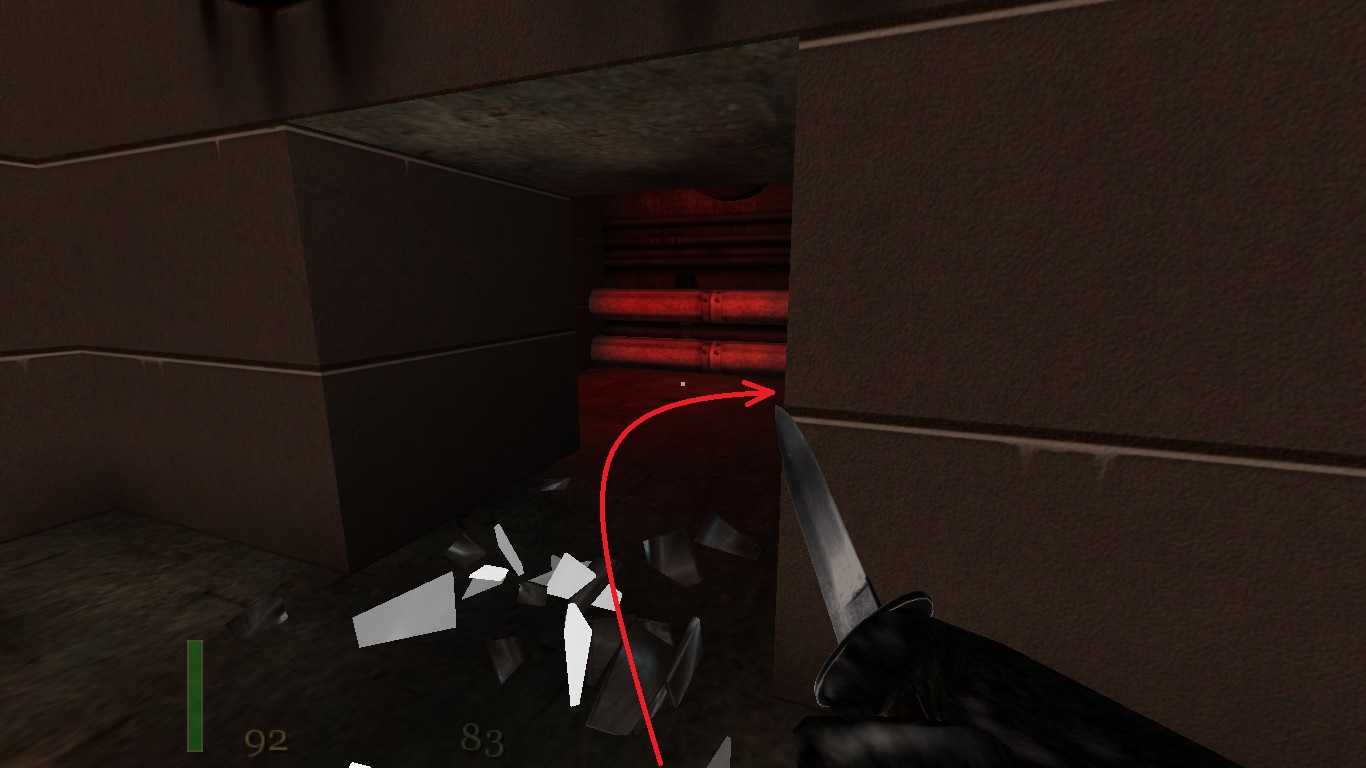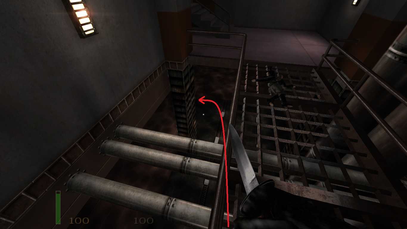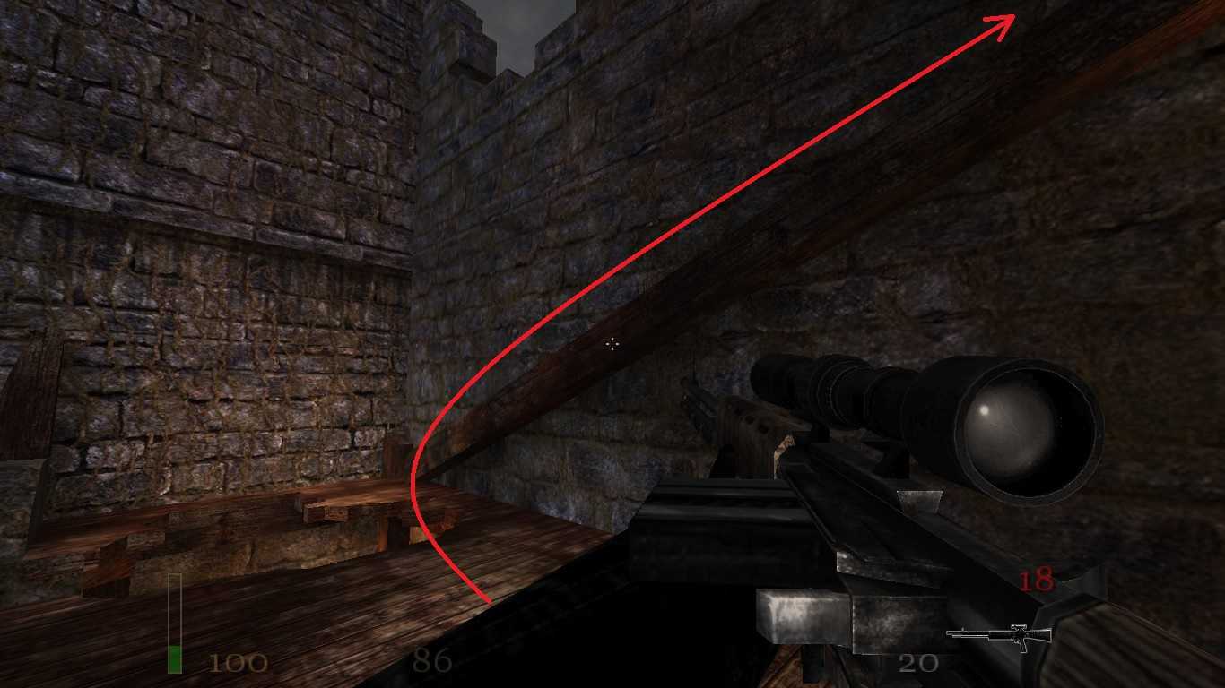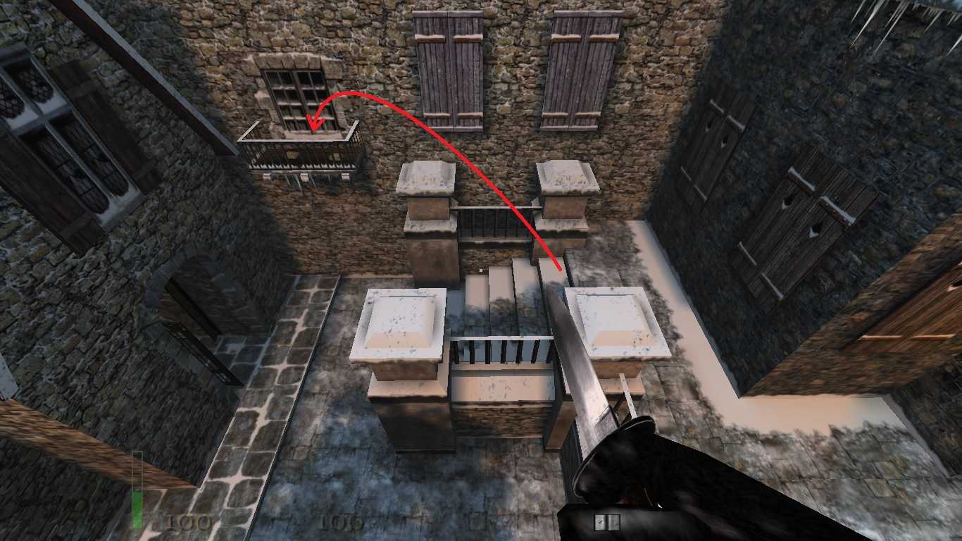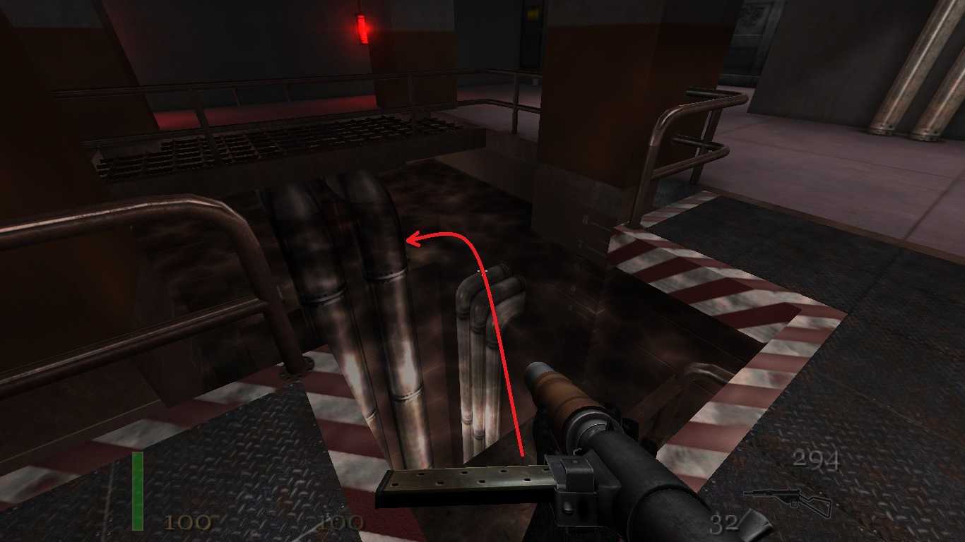 1:В конце карты есть железная балка. Запрыгните на ее. Сверху можно заметить часть от второго этажа.