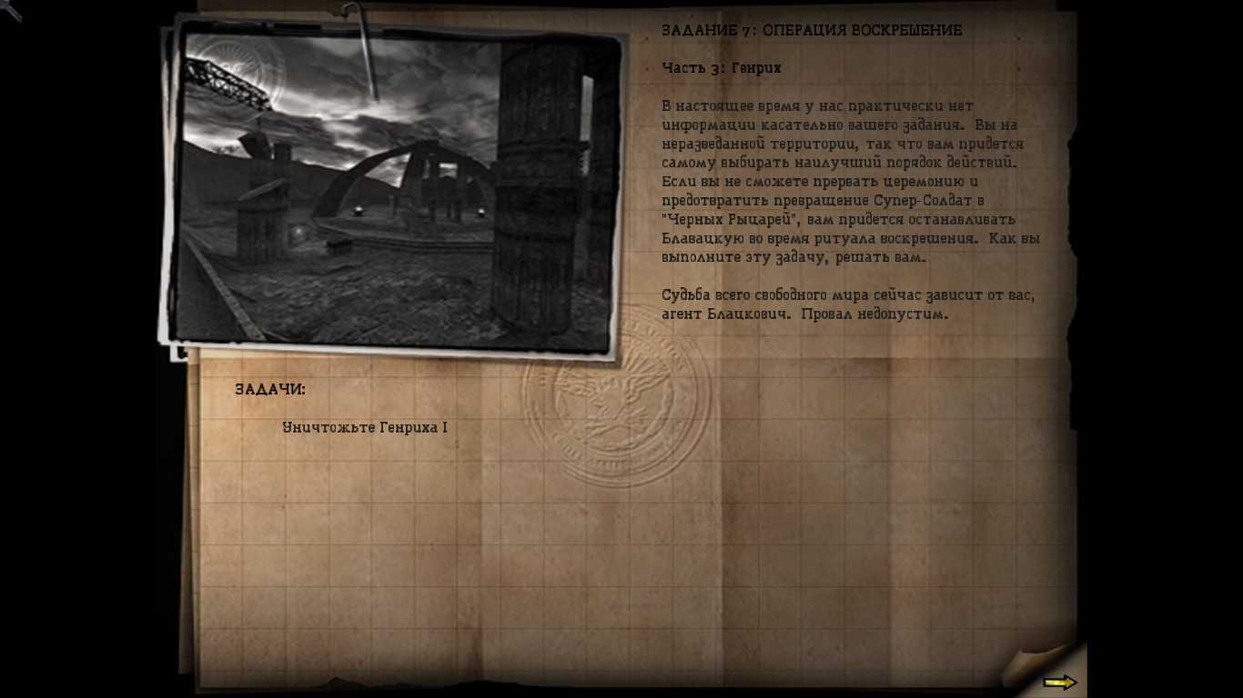 Блазкович ликвидирует верхушку Паранормальной дивизии и пытается остановить процедуру посвящения суперсолдат в Тёмные рыцари, но опаздывает. Приглашённый медиум Марианна Блаватская успевает пробудить Генриха I, но это стоит ей превращения в зомби. Прохождение Return to Castle Wolfenstein заканчивается последним боем агента, в результате которого Генрих и вся нечисть оказываются окончательно уничтоженными, а планы по завоеванию мира — сорванными.