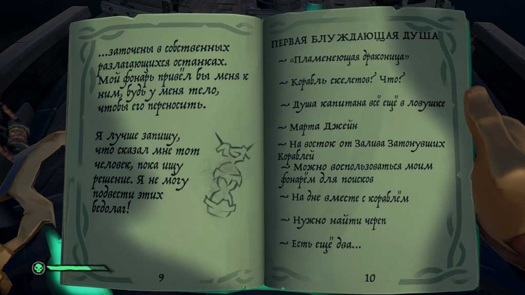 Приблизившись к бушприту затонувшего призрачного корабля – ныряем в воду. С помощью магического фонаря можно посмотреть на остатки корабля, но для нахождения черепа он не особо нужен. Покрутив головой, вы сразу заметите блеск сокровища – это и будет череп. Подбираем его и выходим на берег острова, где отдаём череп Пендрагону: