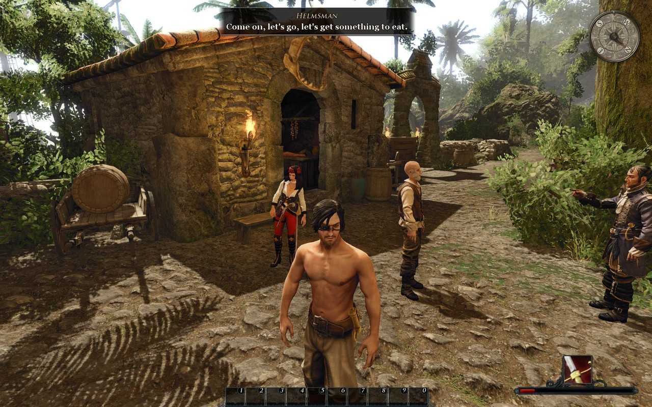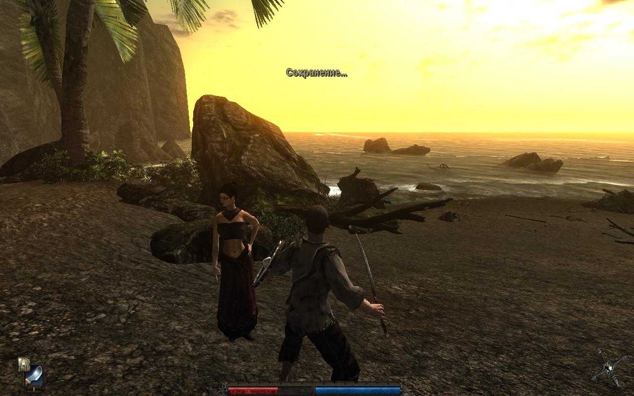 **Пиратские проблемы — на северо-востоке острова найдите костер, а возле него парня. Он даст квест на сбор предметов. Для этого надо пойти в город и по меткам собрать предметы. Перед тем, как взять задание, сохранитесь. У меня были баги с этим квестом, я не мог найти мешок.