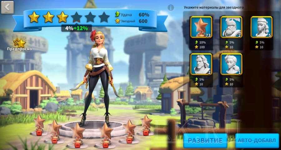 На 10, 20, 30, 40 и 50 уровнях нужно получать звезду, которая открывает дополнительные навыки и позволяет прокачивать уровни дальше. Достигнув 20 уровня и открыв 3 звезду Герой может образовывать связки с другими героями. Об эффективности таких связок читайте ниже. Звёзды можно открывать расходуя скульптуры звёзд. Расходовать скульптуры героев на повышение звёзд крайне не выгодно, это дорого и малоэффективно. Чем больше у героев звёзд, тем тем больше нужно скульптур на открытие новой звезды. И чем выше качество героя, тем труднее найти для него скульптуры звёзд.