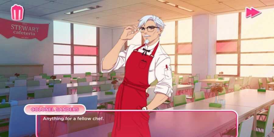 Я люблю тебя, полковник Сандерс! Комедийный симулятор свиданий, созданный Psyop по заказу KFC. Игроки взаимодействуют с игроками в кулинарной школе в течение трех дней, одним из этих персонажей является плодовитый полковник Сандерс. Игра задумана как забавный маркетинговый ход от KFC, но в ней все же есть действительно приятные моменты игрового процесса. Это короткая игра, в которую можно играть за один присест.