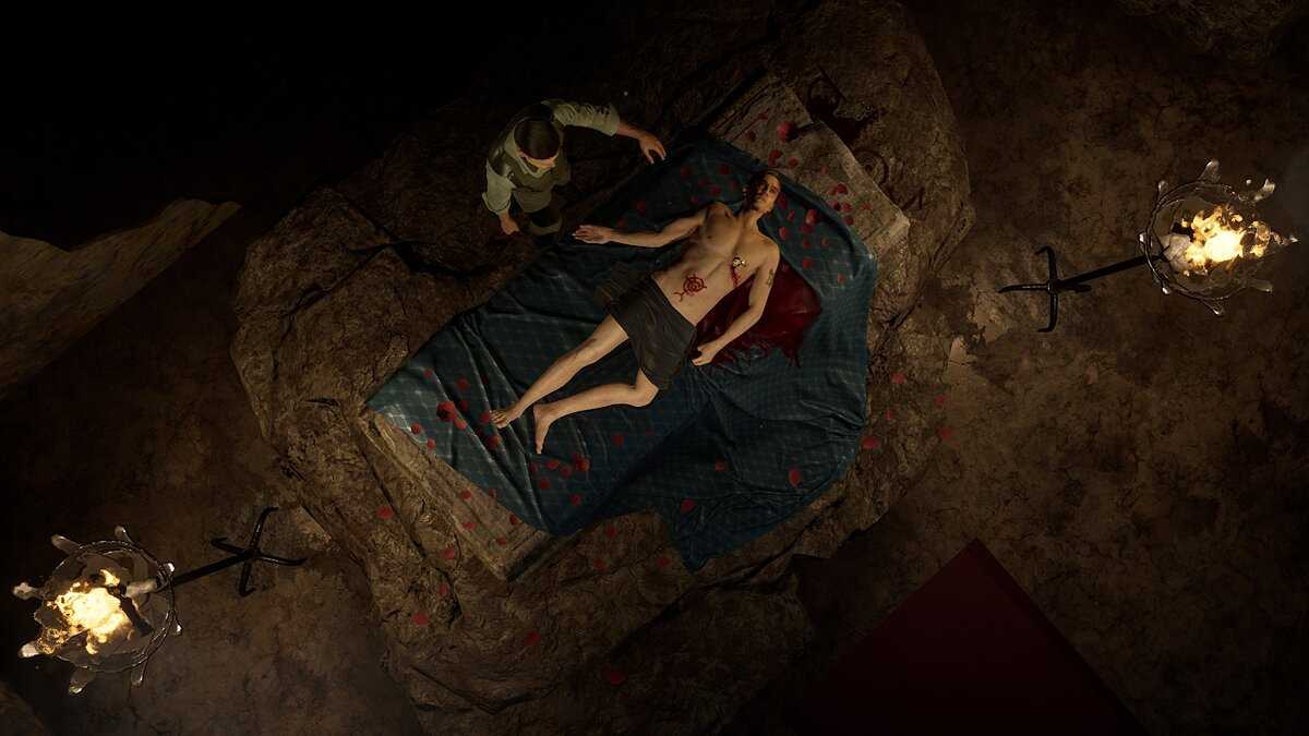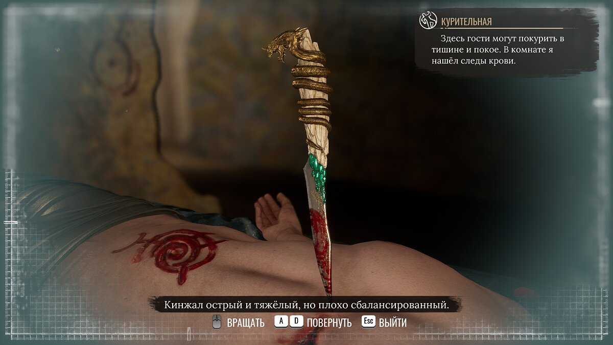 Следуем в другое помещение через белые двери и находим очередной труп. Изучаем предметы на камне справа и символ на стене. Смотрим на тело: татуировка, кинжал, рана, символ, голова и рука.