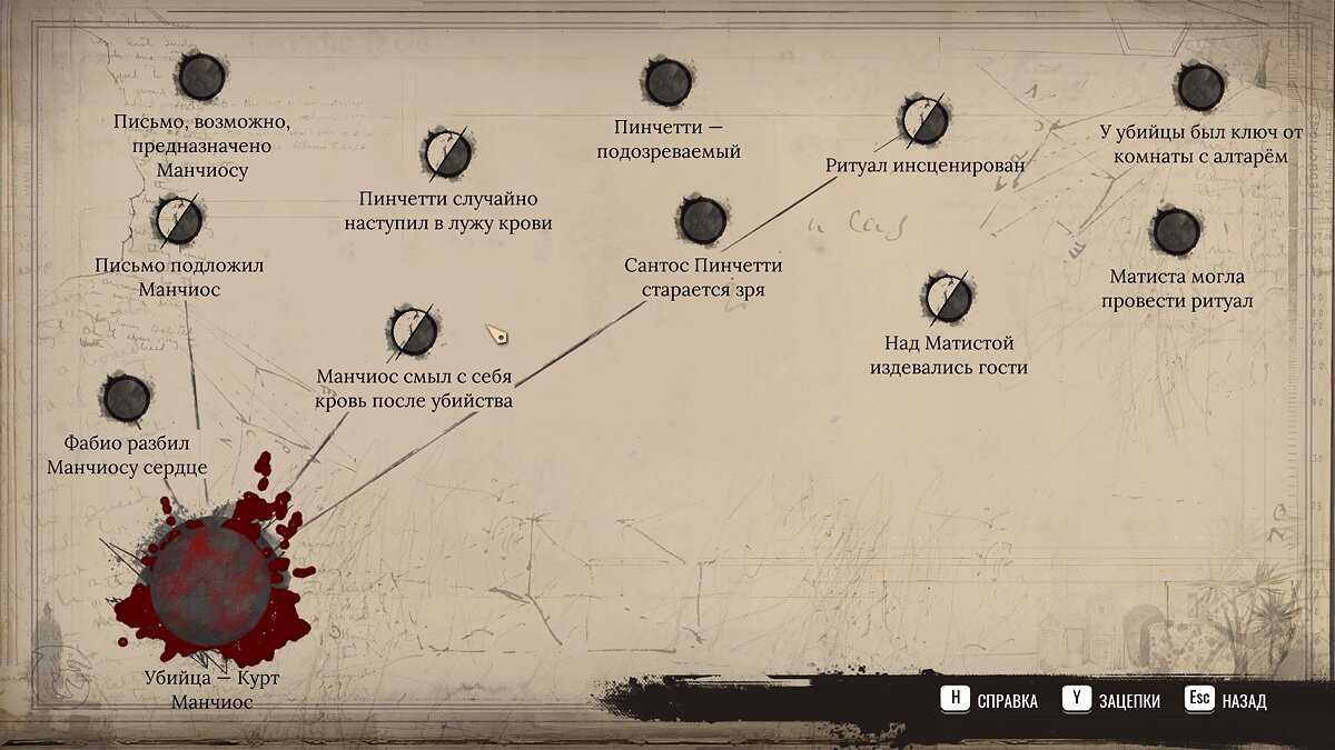 Поочерёдно предоставляем Фогелю, Матисте и Манчиосу улики «Сила любви: кровь и мандрагора» и «Письмо от Фабио». Соединяем все улики в чертогах разума и обвиняем Манчиоса, Матисту или Сантоса.