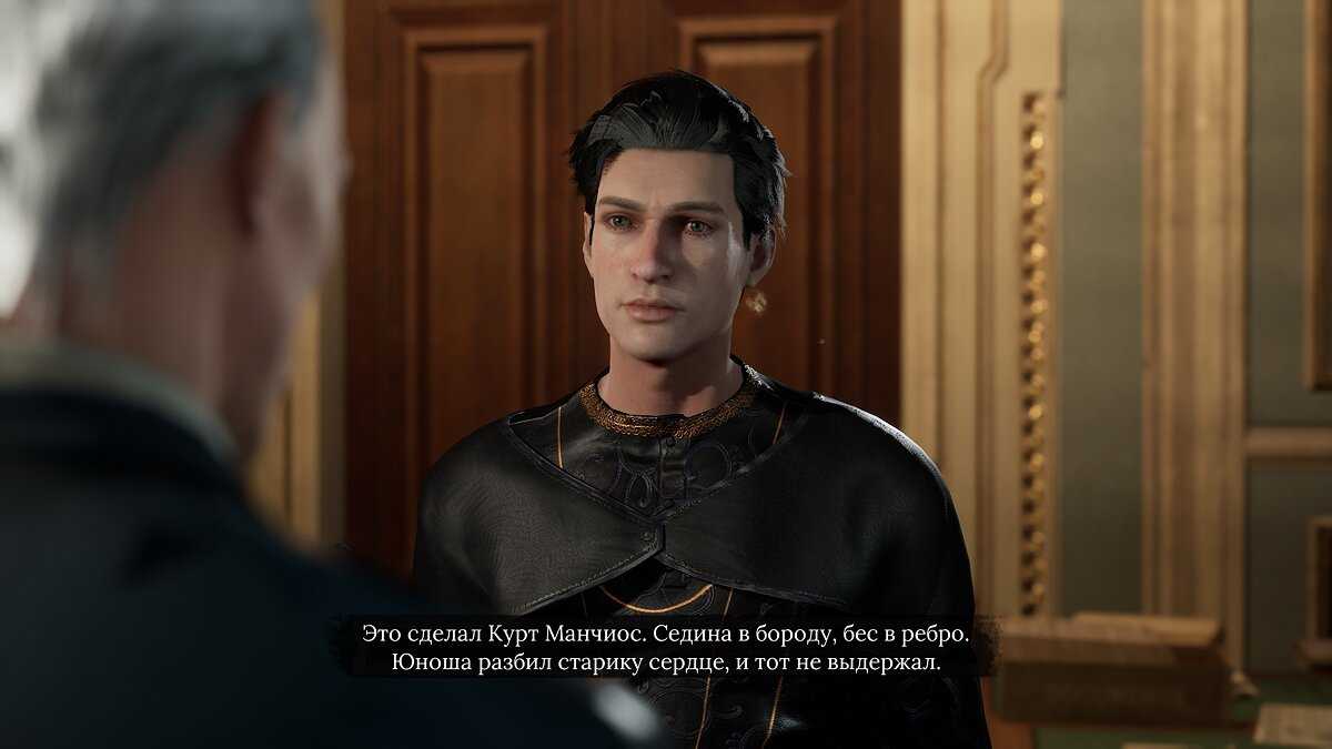 Снова соединяем мысли в чертогах разума. Представляем улику художнику и активируем запись «Как выглядит Курт Манчиос». Разговариваем с мужчиной в общем зале, который стоит к фонтану спиной.