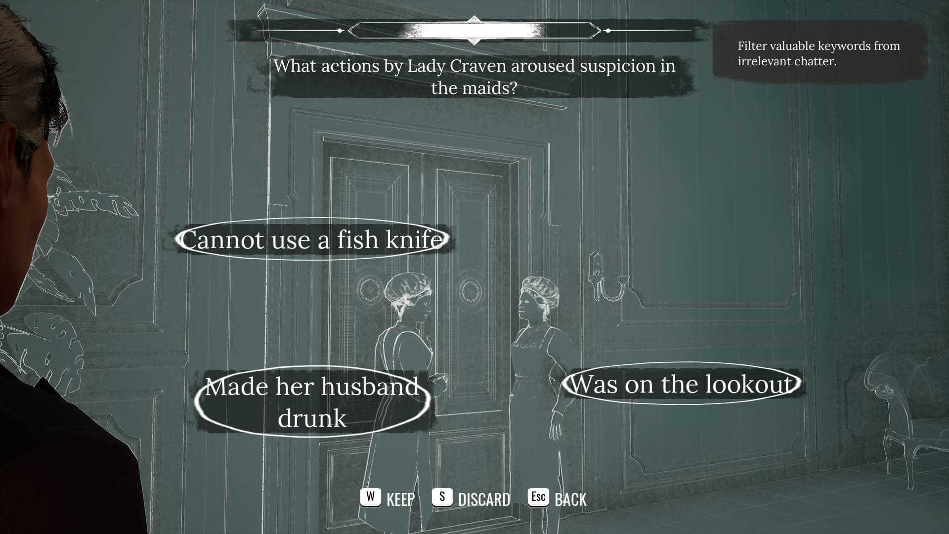 Now you’ll need to go upstairs to Lord Craven’s suite, number 226. As you approach, you’ll find two maids gossiping outside the door. You must listen in on the pair before you can proceed. Eavesdropping is a QTE sequence of sorts. You’ll need to mark relevant information and ignore idle gossip as it pops up on the screen. If you correctly select relevant information, it will be circled while useless chatter will be scratched out. The following pieces of information are relevant to the case: