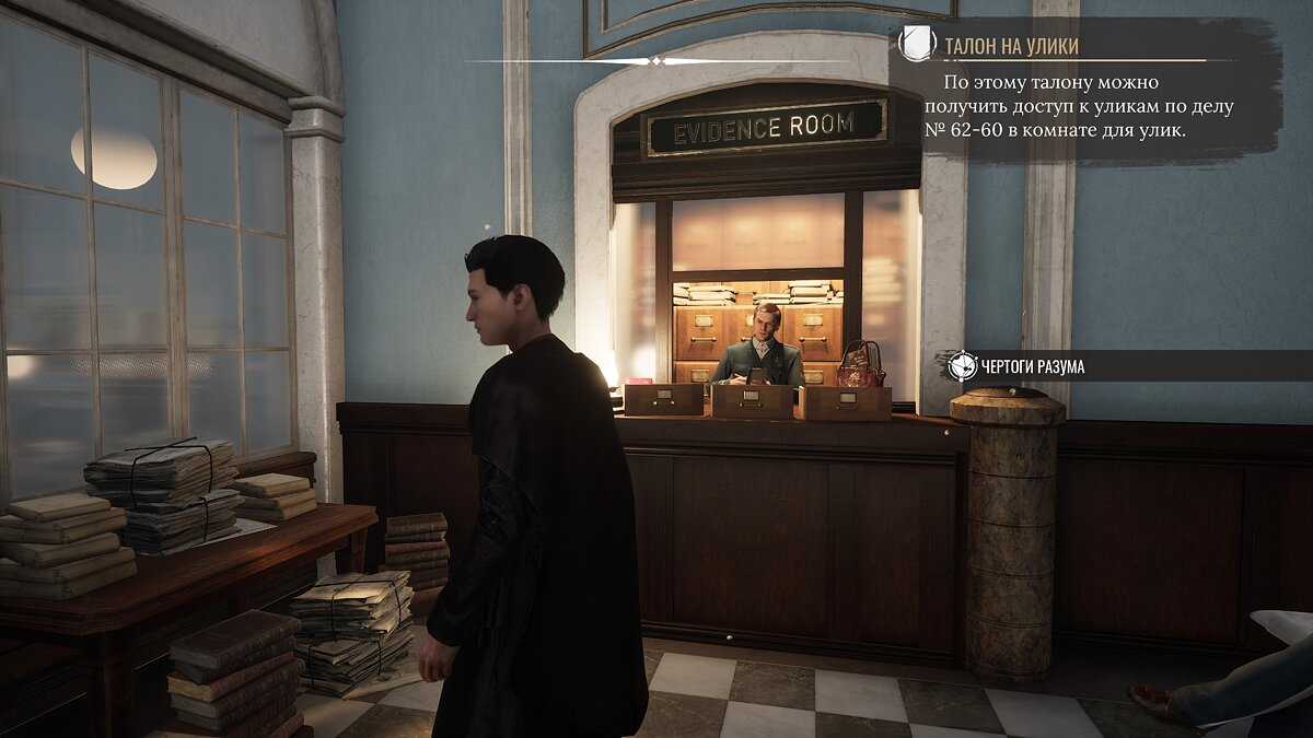 Предоставляем улики Пинчетти и Манчиосу. Проходим к стойке с надписью «Evidence Room» в соседнем крыле и изучаем все полученные по талону предметы.
