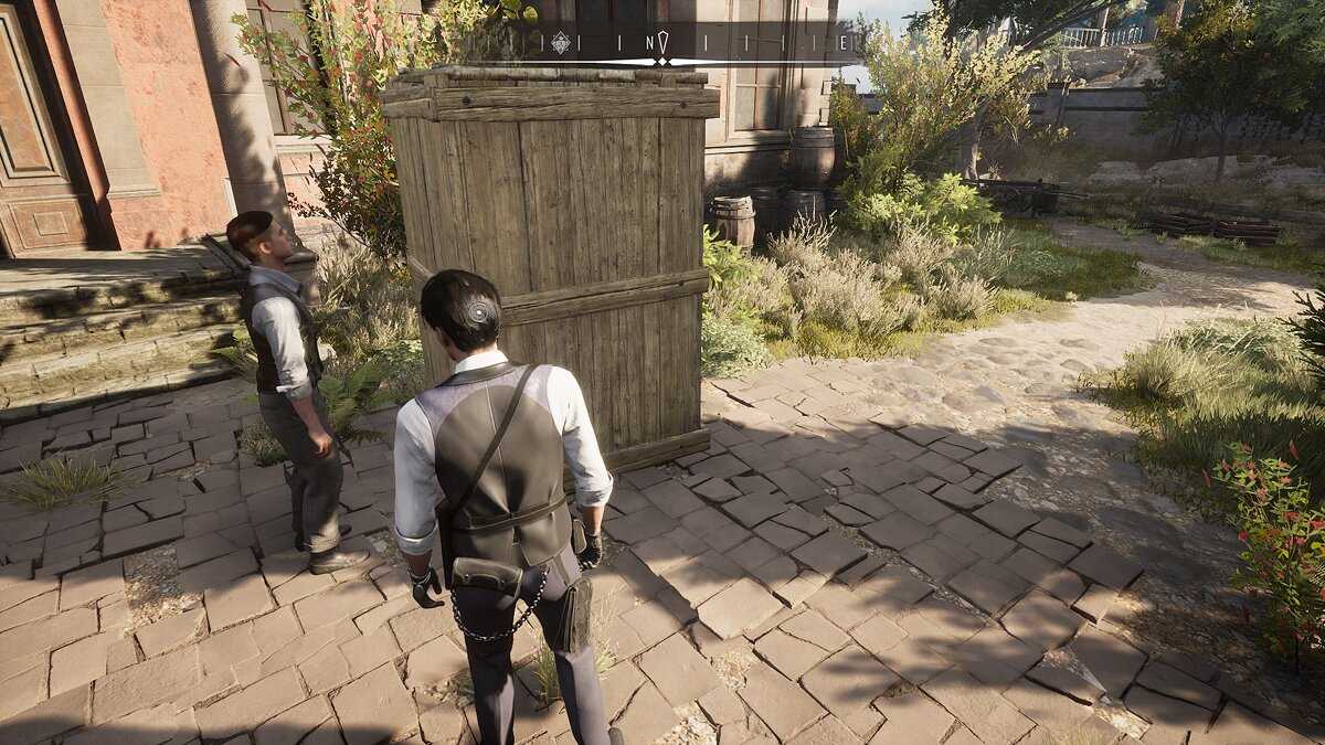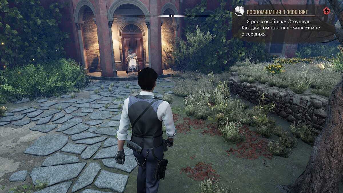 Идем к беседке. Осматриваем книгу на столе, артефакт и слушаем разговор Майкрофта и Рихтера. Входная дверь и инвалидная коляска. Толкаем коляску по саду. Чертоги: